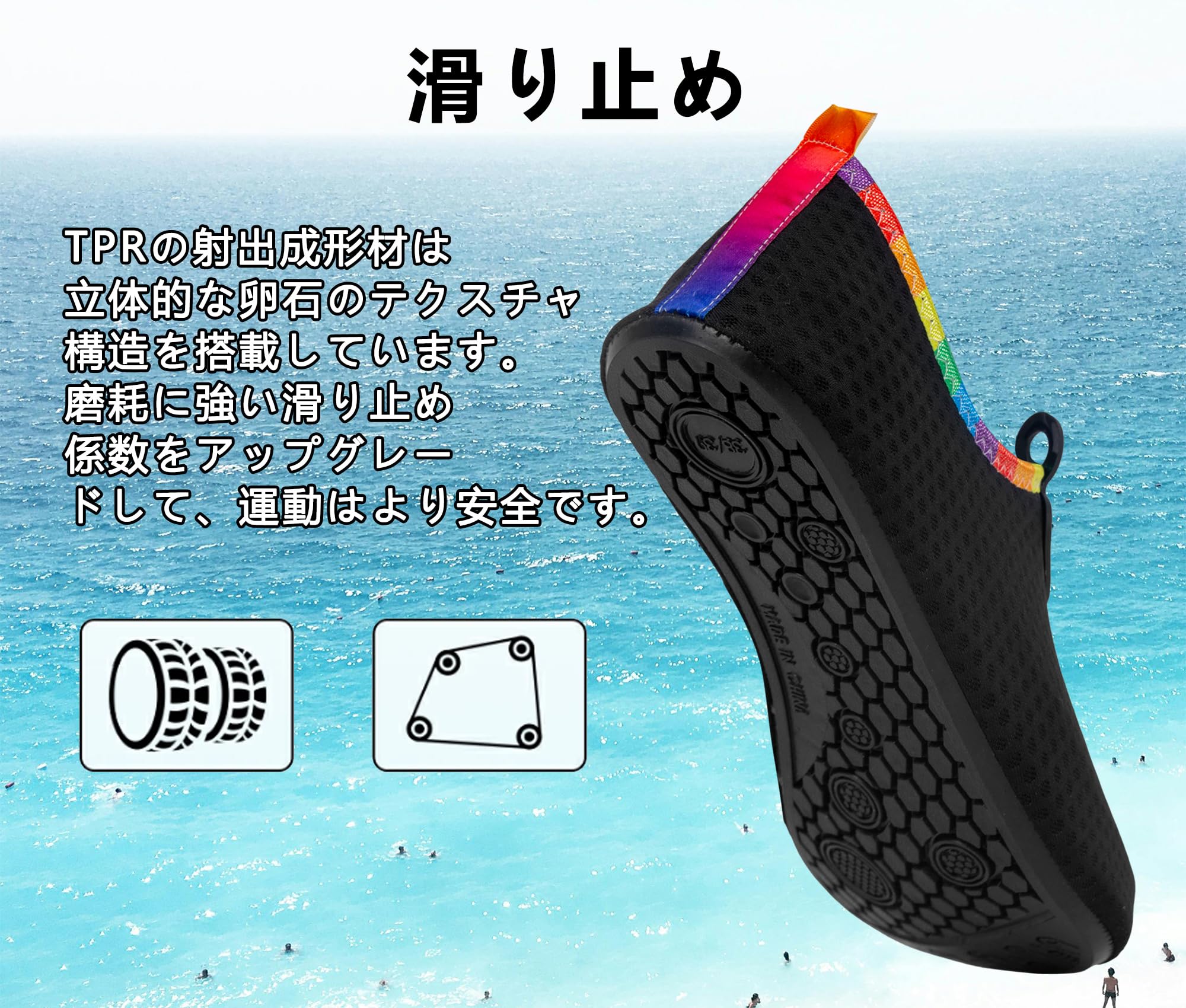 【ソール】マリンシューズ ソールは滑り止めのゴムです。だから、水、ジム、ビーチで楽しみを持つことができます。ソフトで柔軟です。