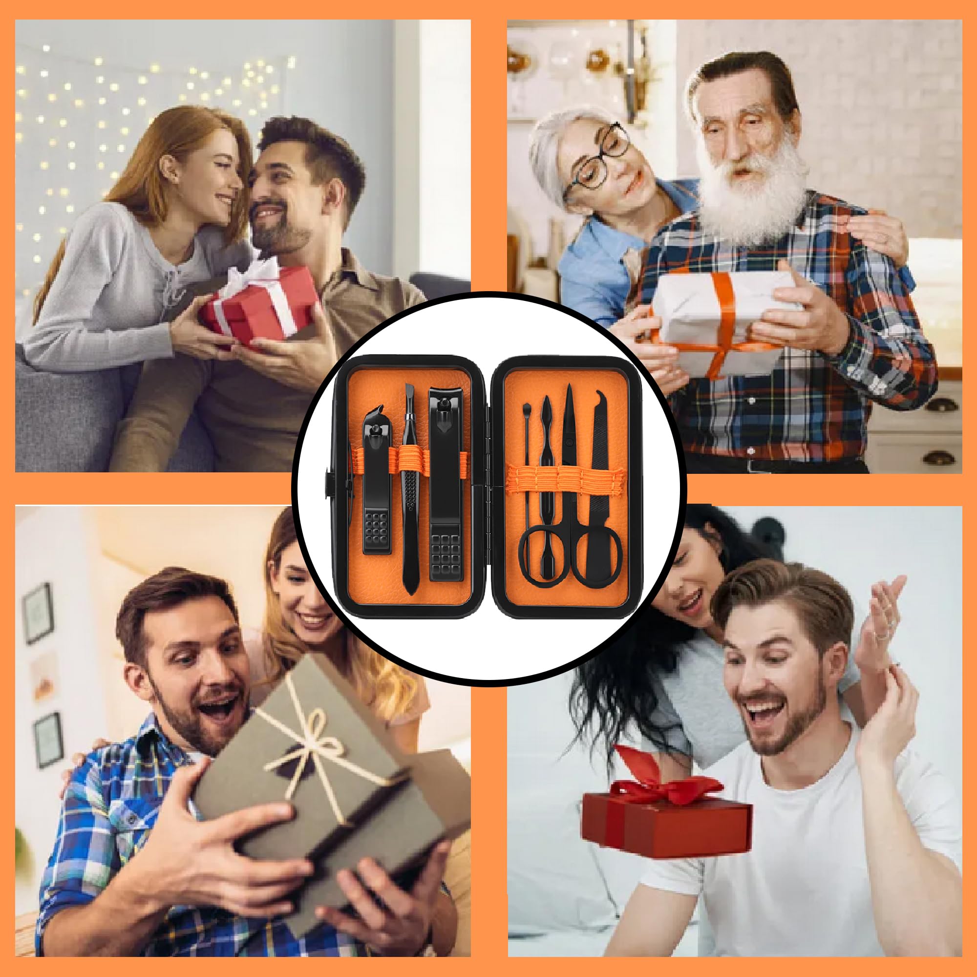 [メンズレディースマニキュアセット] ユニークな黒+オレンジの配色で、この爪切りセットは、男性と女性の両方に適しています。ハンドケア、フェイシャルケア、フットケアツール(大型爪切り、小型斜め爪切り、眉毛はさみ、眉毛ピンセット、耳かき、爪やすり、爪クリーナー、携帯用トラベルPUケース)を含む多機能トラベルマニキュアセット。