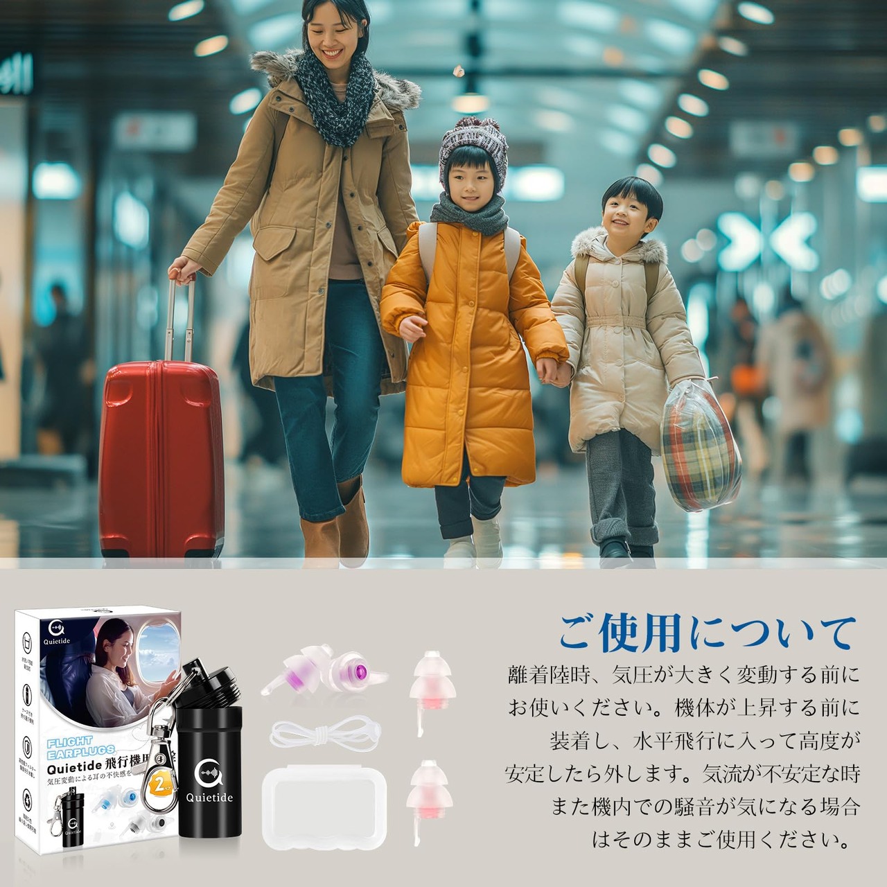 【Quietide飛行機耳栓】★Quietide飛行機用耳栓はフライトの環境用に独自開発された特殊なサウンドフィルターを採用することで、会話や機内アナウンスはクリアに保ちながら、雑音や気になる音を抑えます。飛行機の離着陸の際に、急激な気圧変動で起こる鼓膜や耳の痛み・不快感を効果的に軽減できる。電子機器ではありませんので、離陸から着陸まで全ての時間で使用できます。 ※スポンジ耳栓のように消音してくれるのではなく、Quietideのイヤープロテクターは、一定の音圧軽減ができるようにデザインされていますが、音質を落とすことなく聴覚にダメージを与えないレベルまで安全に音量を絞ることが出来ます。騒音性難聴、飛行機離着陸の耳鳴りなどのリスクを最小限に抑えられます。