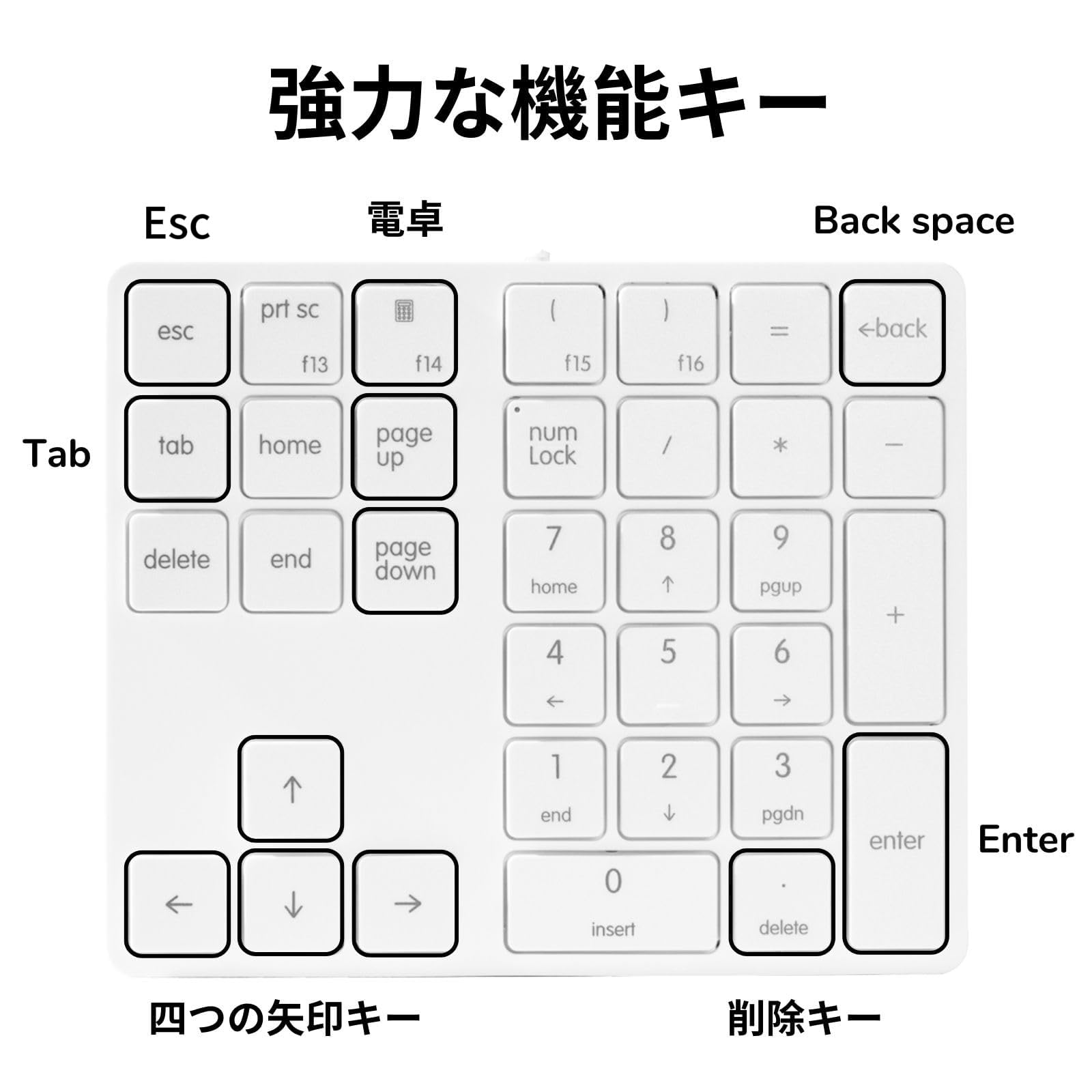 ?【34キーのテンキー】:このテンキーは大量の打字タスク向けに設計されています。これらの34のキーには、一般的に使用されるデジタル処理機能が含まれており、メインキーボードとコンピューターのテンキーの間で手の移動が必要ありません。このキーボードには、Esc、Tab、Back Space、Delete、Home、End、Prt sc、および四方向の矢印キーなどの重要なキーも組み込まれています。また、いつでもキーボードの計算機能を便利に起動できるように、電卓のショートカットキーも含まれています。