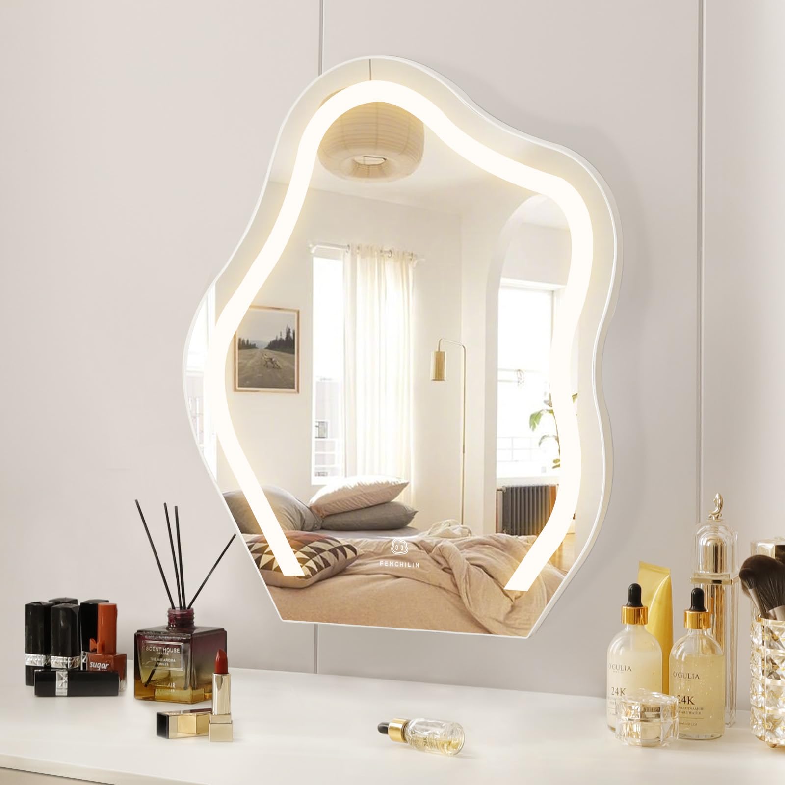 FENCHILIN 女優ミラー ハリウッドミラー 鏡 ライト付き 卓上 壁掛け 両用 ウェーブミラー 卓上ミラー 壁掛けミラー 化粧鏡 led ミラー 女優鏡 三色照明モード 無段階調光 10倍拡大鏡付き くも型 39.7×49.6CM