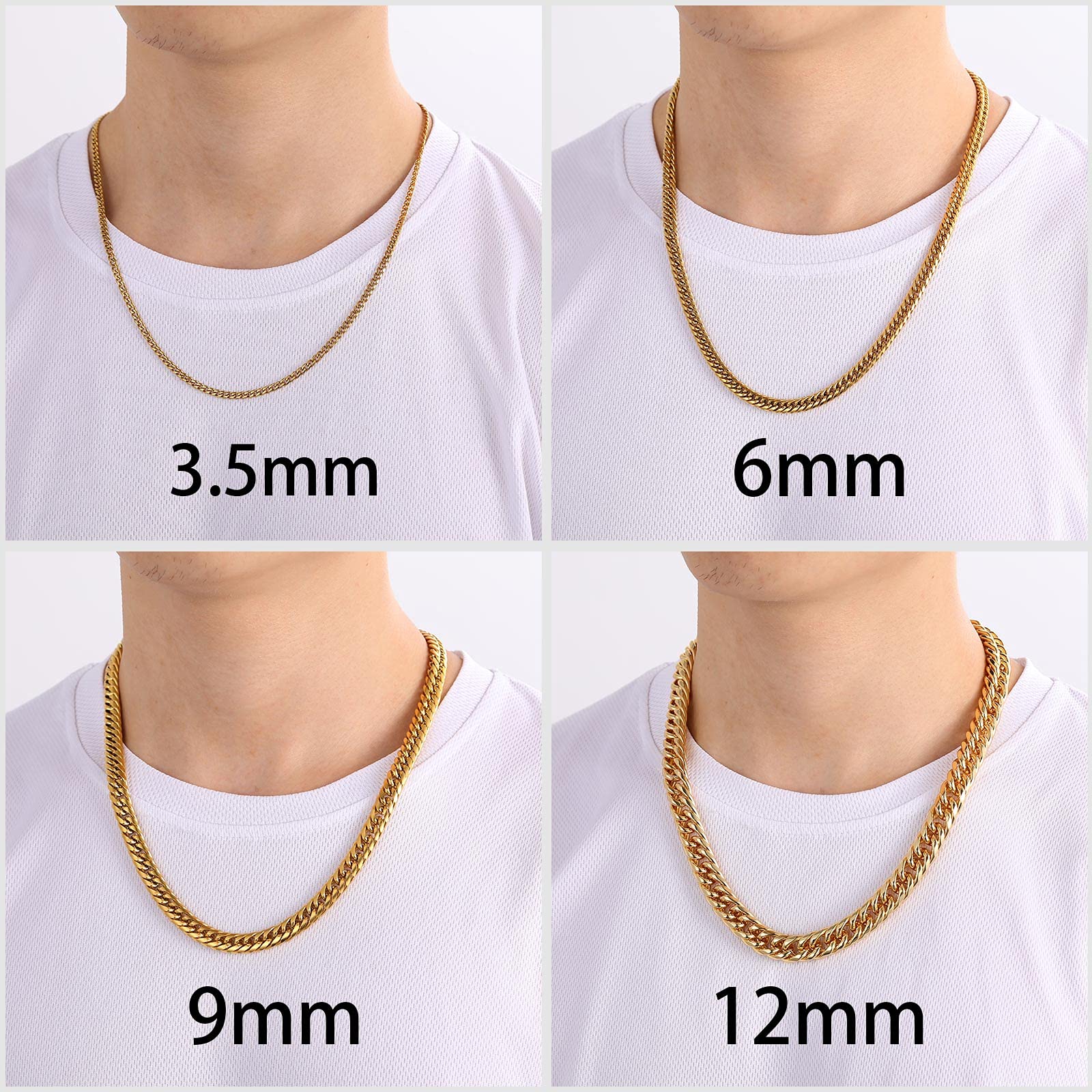 【色も!太さも!長さも選べる!】3.5mm、6mm、9mm、12mmの4太さ、シルバー、ゴールド、ブラックの3色、46cm、51cm、56cm、61cm、66cm、71cm、76cm、91cmの8長さ、全72種類を揃えました!