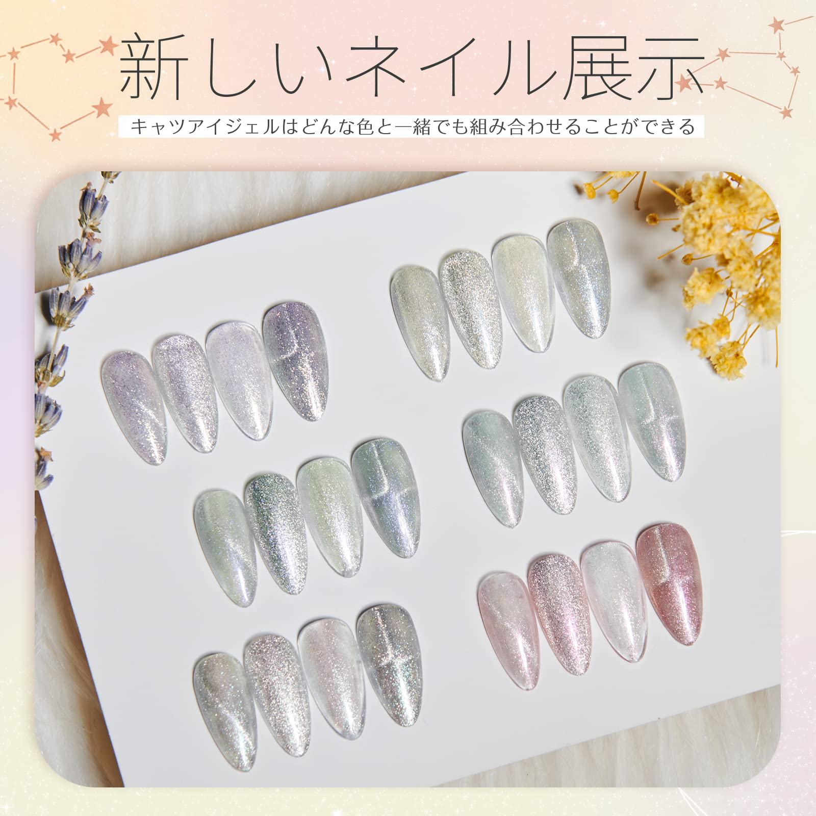 ジェルネイルキット:6色*7 ml 猫目ジェル、キレイな発色で、気分に合わせて、お好みに組み合わせます。角度によって違う表情を見せる不思議なアートが出来ます(マグネット付き)