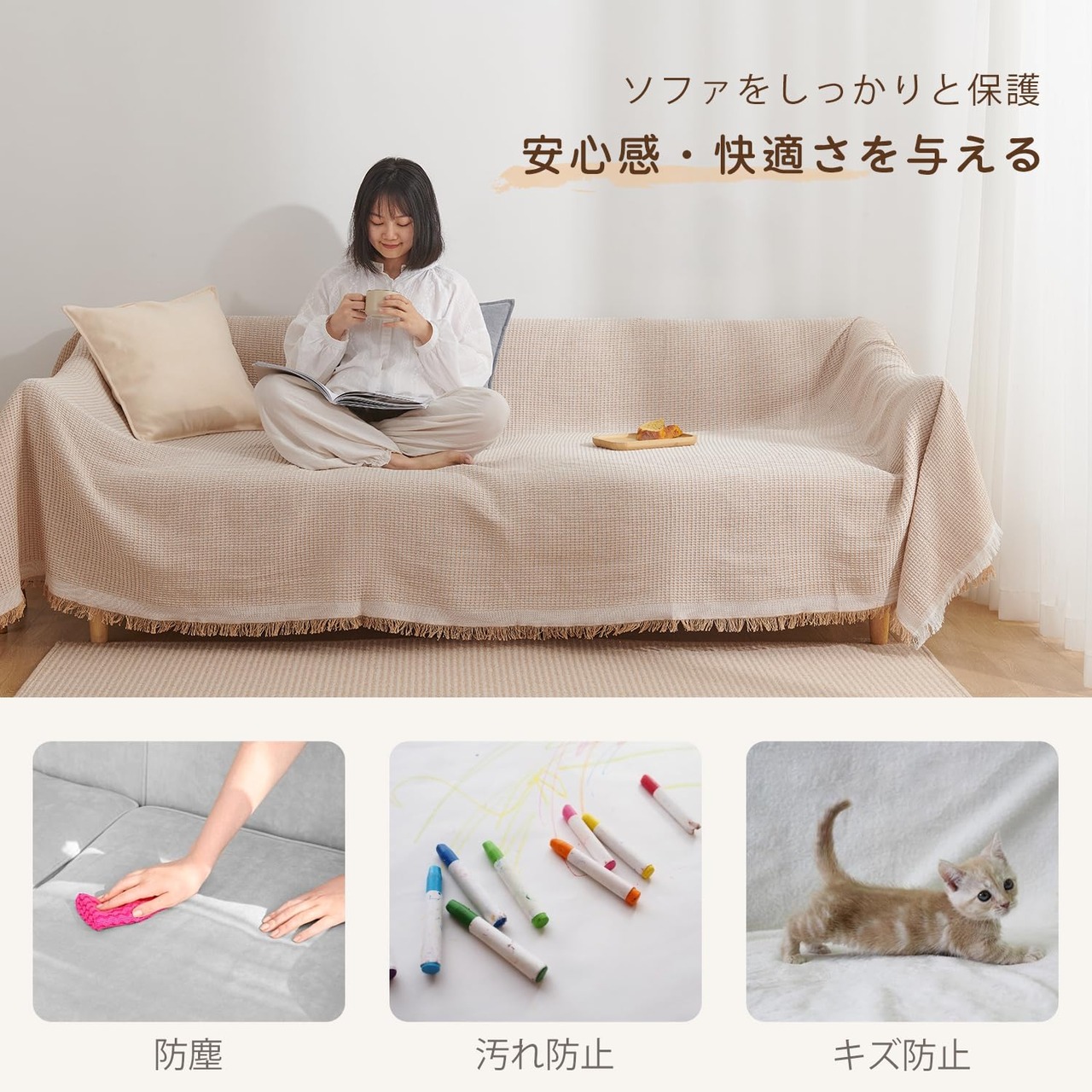 ・【幅広い使用範囲】かけるだけでソファー全体をカバーでき、防塵やキズ防止などの機能があり、ソファーをしかっりと保護できます。多機能で、ベッドカバー、テーブルクロス、冷房毛布、ひざ掛け、防塵カーペット、キャンプカーペット、旅行毛布などとして一年中活躍できます。