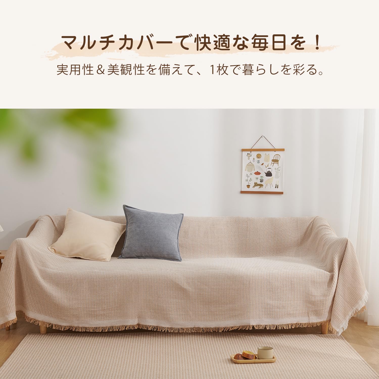 ・【デザイン】立体感のある北欧風デザイン(ワッフル柄)と、ナチュラルなフリンジ付きで、シンプルながらもオシャレ度が高い。優しいカラーはインテリアと合いやすく、気軽にお部屋の飾り付けを実現。