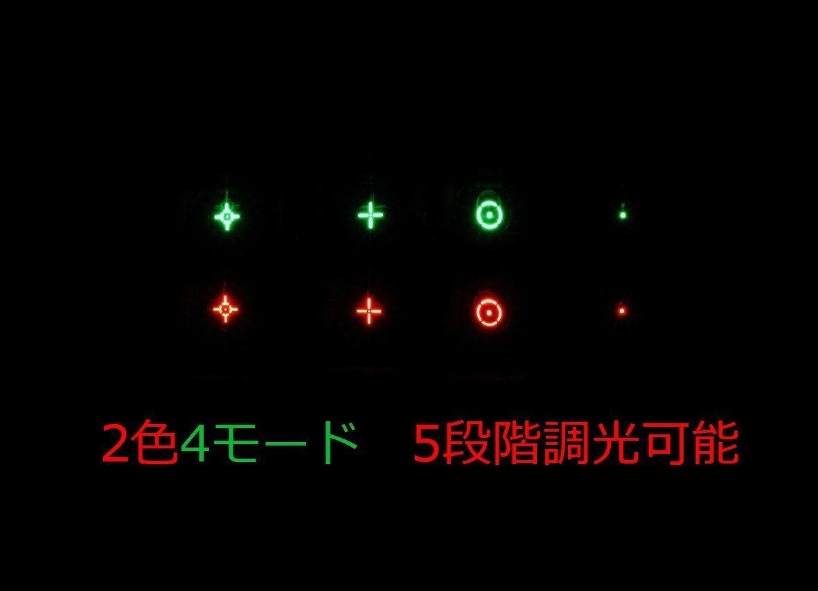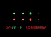 照準色:赤、緑 照準形状:4パターン(並びやパターンが写真と異なる場合もございます) 輝度:赤、緑それぞれ5段階