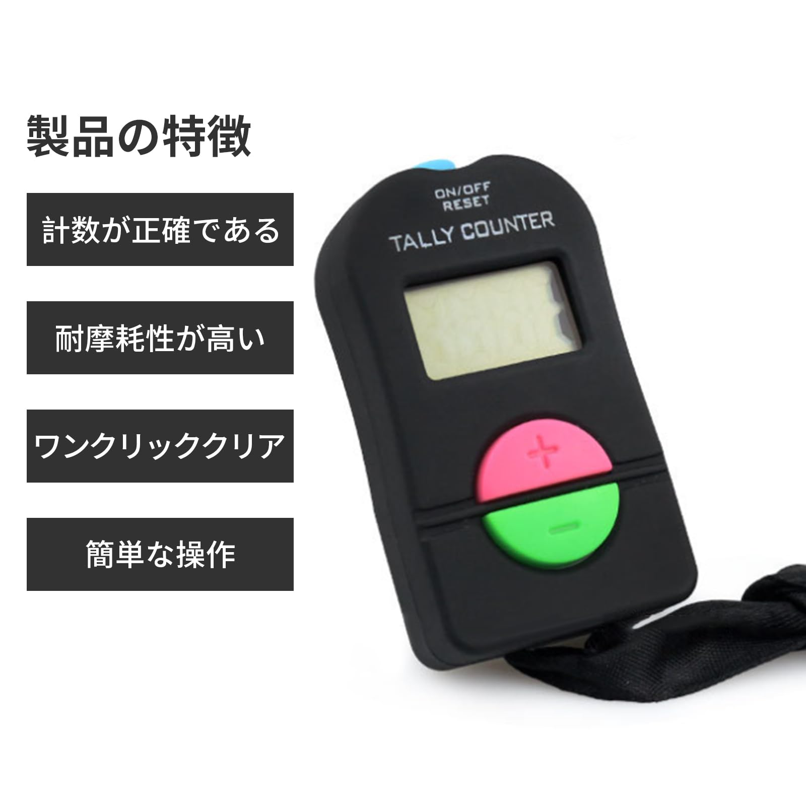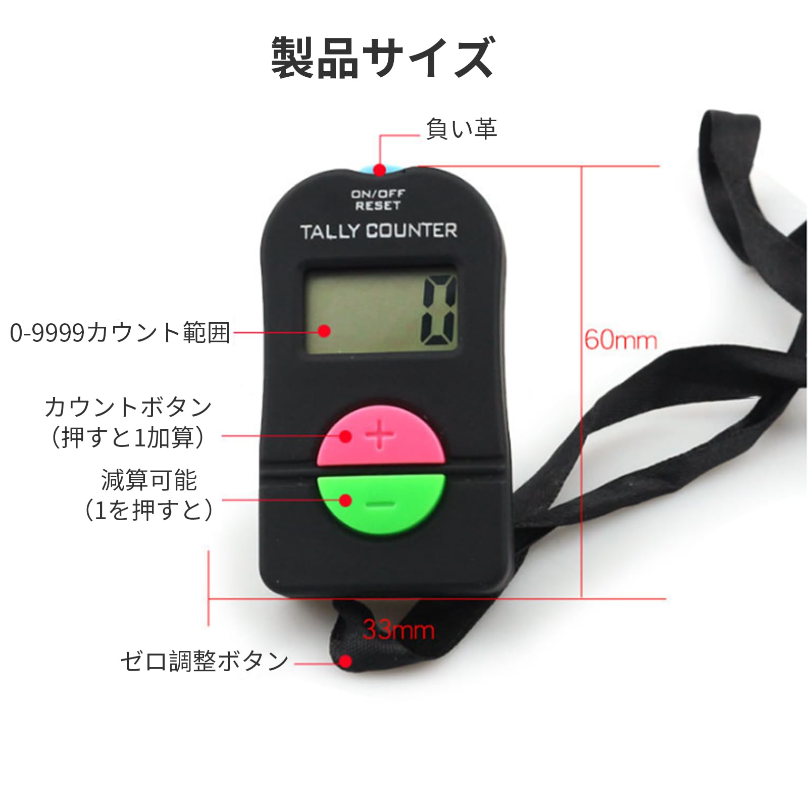 【製品仕様】材質:ABSサイズ:約60 * 33 * 20mm、電圧:1.5V、最大カウント:0-9999(秒)、カラー:ブラック。 電池:LR44ボタン電池1個 【実用的なツール】これは実用的な4桁マニュアルカウンターです ピンクのプラスボタンと緑のマイナスボタンで0から9999までカウントする実用的なカウントツールです 【使いやすい】カウンター上部に青いリセットボタンがあり、操作が簡単です 【持ち運びが簡単]】カウンターは軽量、小型で、黒いロープストラップが付属しているので、外出時に首からぶら下げたり、バッグに入れたり、バックパックに結んだりすることができます 【様々な場面】:波止場、倉庫、駅、道路、教会、広く人や物の定点カウント、公共の場での車両カウント統計に使用され、また、あらゆる種類のスポーツやトレーニングのカウントに使用することができます