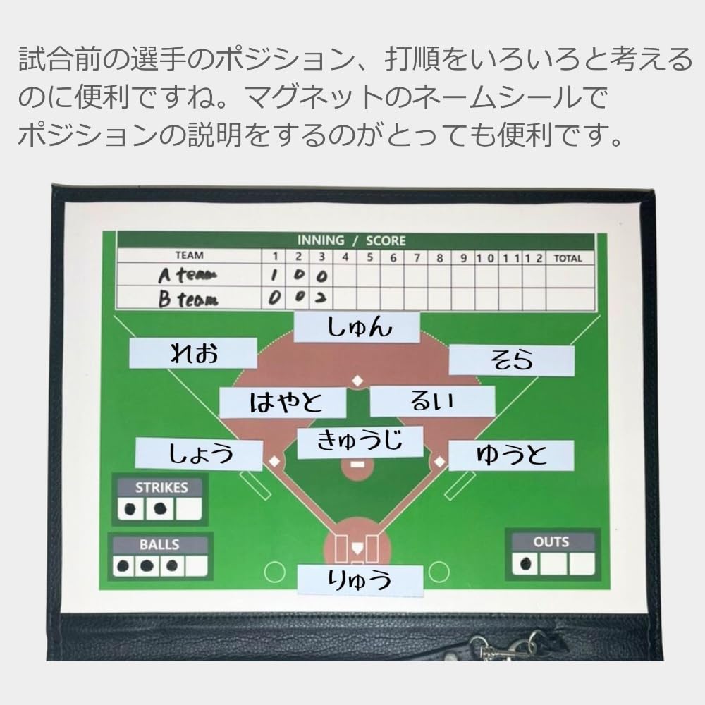 マグネットのネームシールに選手の名前を書いて作戦盤に貼り付け可能。