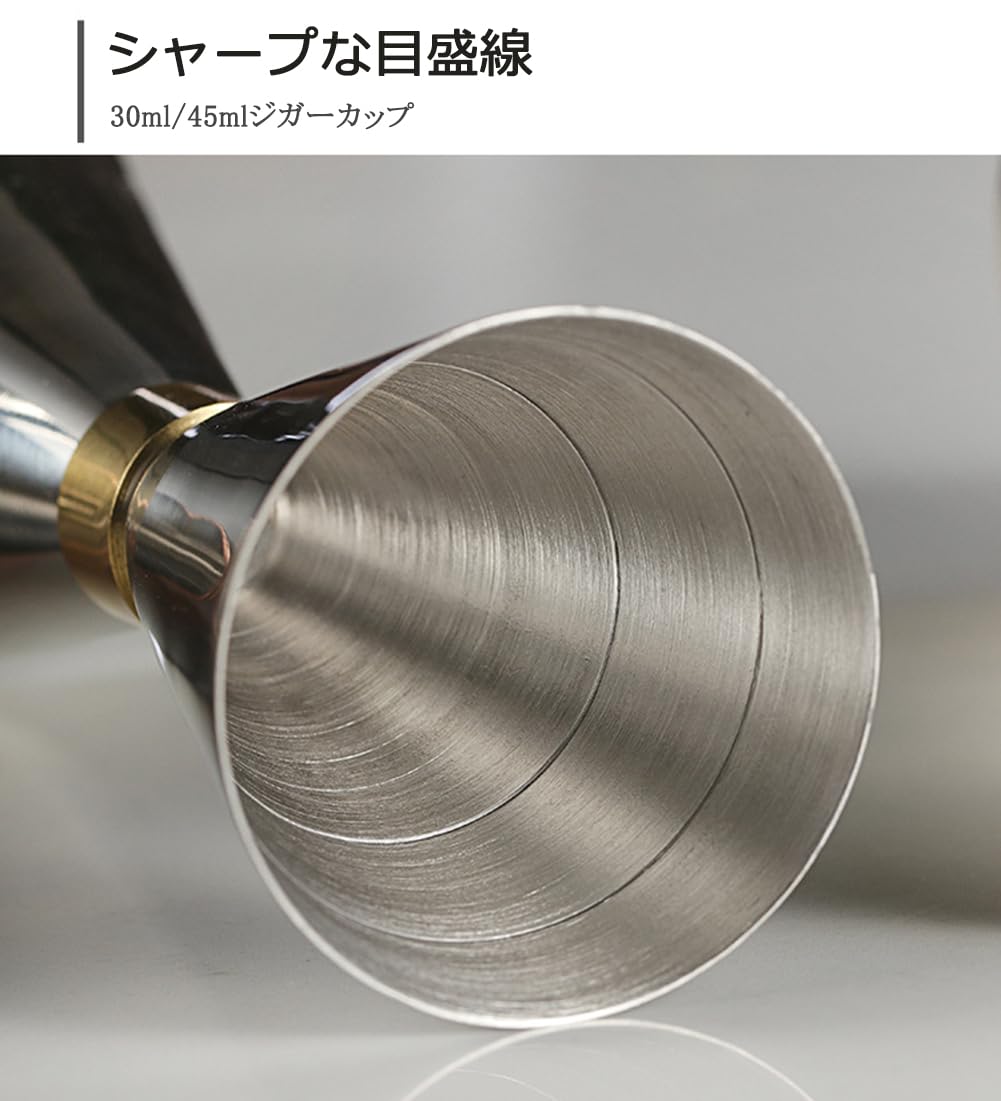 【ジガーカップ】小さなヘッドカップは30mlで満たされ、内部の目盛りは10ml、20mlです;大きなカップは45mlで満たされ、内部スケールは15ml、30mlです。2種類の単位目盛があり、それぞれmlとOZで、どんなバーテンダーにも適しています。明確で正確な目盛,正確な測定がされます。滑らかで手を切ることはありません。初心者でも快適に使えます。