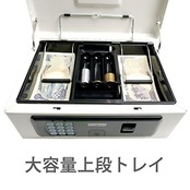 テンキータイプのキャッシュボックス(手提げ金庫)。上段トレイにはたっぷりの小銭、お札が収納でき、トレイの下にも通帳、印鑑、札束等を大容量に収納可能です。キーが不要のテンキー暗証番号式。暗証番号は1桁から最大8桁まで設定可能な為、簡易的な使い方から8桁暗証番号の強固なセキュリティ運用まで、お客様の用途に合わせてお使い頂けます。 大容量キーボックス等と同様の、板厚20mmのボディ部分、板厚1mmのフタ部分、取っ手は金属製のハイセキュリティ仕様です。
