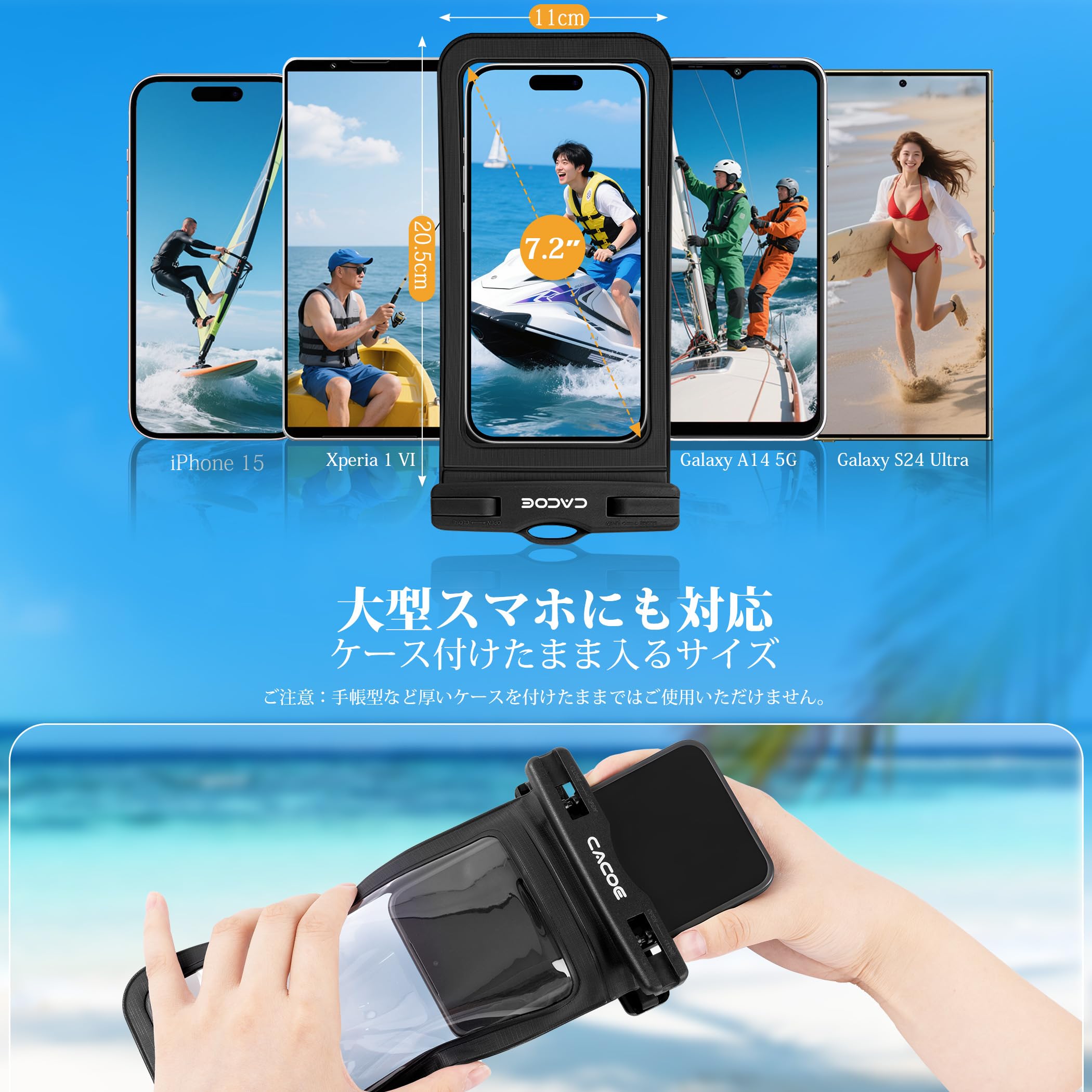 【3枚入り・防水携帯ケース、大型スマホにも対応】家族・カップル・友達同士でシェアでき、傷ついてもまだ予備があります。最大7.2インチ対応スマホ防水ケース、iPhone全機種、Sony Xperia、Xiaomi、AQUOS、Samsung Galaxy、Huaweiなど大画面スマホもケースを外さずそのまま収納でき、旅行先での手間を削減します。お客様満足度向上のために、防水ケースの全面検査システムを導入した上、365日の品質を提供しています。夏の必需品、Cacoeでより安心!