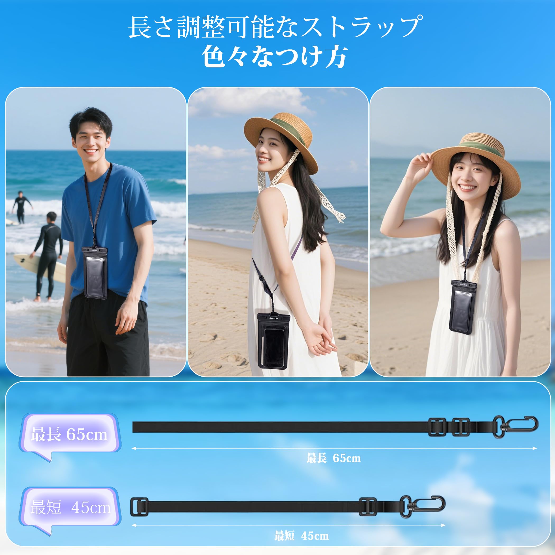 【上質素材採用・長さ調整可能なストラップ】Cacoeスマホ防水ケースは、高密度ポリエステル製ストラップを採用します。海水や洗剤に強く、長時間使用でも劣化しにくい耐久仕様です。また、防水携帯ケースのストラップは長さ調整が可能で首から下げたり、肩に斜め掛けにして使え、子どもから大人まで、身長に関係なく快適にご使用いただけます。