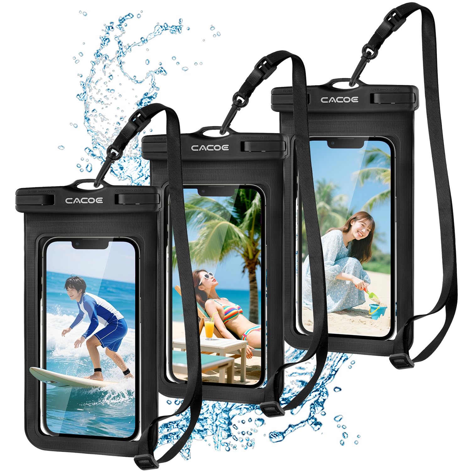 【3個セット・大容量】CACOE スマホ 防水ケース iphone用 防水バッグ 海 お風呂 プール ぼうすいケース 首掛け・斜め掛け 水中 撮影 IPX8 顔認証対応 タッチ可能 iPhone/Android 7.2インチ以下全機種対応 ブラック