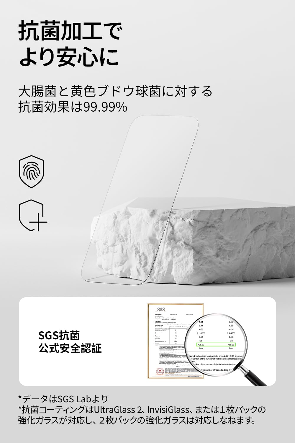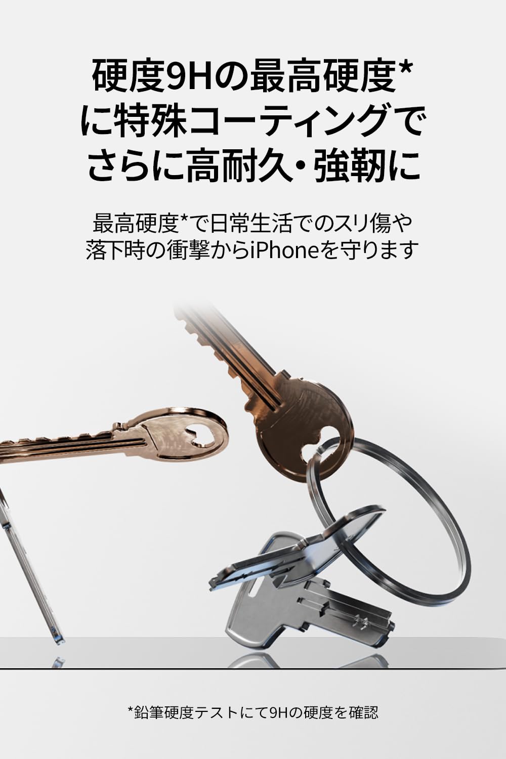 【驚異の耐落下性能】リチウムアルミノケイ酸塩(LAS)採用、通常の強化ガラス(アルミノケイ酸塩ガラス材(AS/Aluminosilicate))と比べて270%高い耐落下性能を実現。0.8mからの落下テストでは100%無傷の試験結果。どんな衝撃からもiPhoneを守ります
