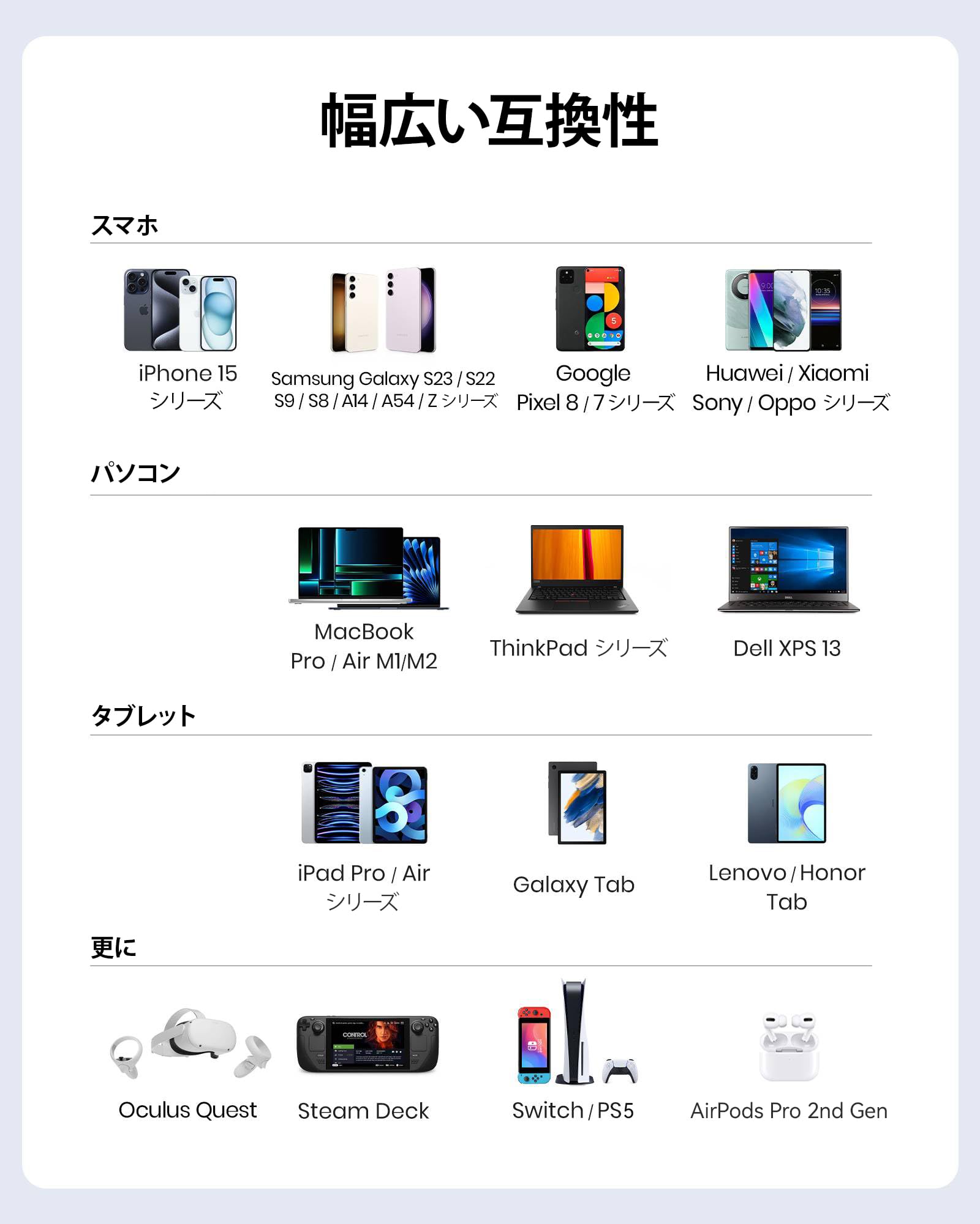 数多くのUSB-Cデバイスに適用可能です。例えばスマホ [iPhone・Samsung・Google・LGなど]・[iPhone] iPhone 1… 表示を増やす