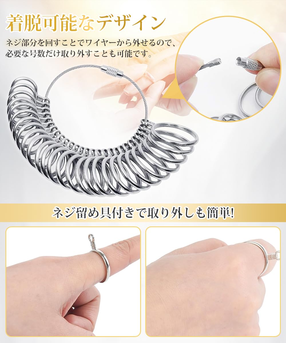 ??測定時のご注意:リングゲージ 自体の重さで 指 と ゲージ の間に隙間ができ、実際の サイズ より緩くなる場合があります。測定時には、ワイヤーから外すかや手のひらに接地させてお測り下さい。指輪を着ける指の腹より第二関節が太い方は、関節が無理なく通るサイズが適正なサイズとなります。体調などで指のサイズが変化することがございますので、朝夕それぞれ1回ずつ測定してください。