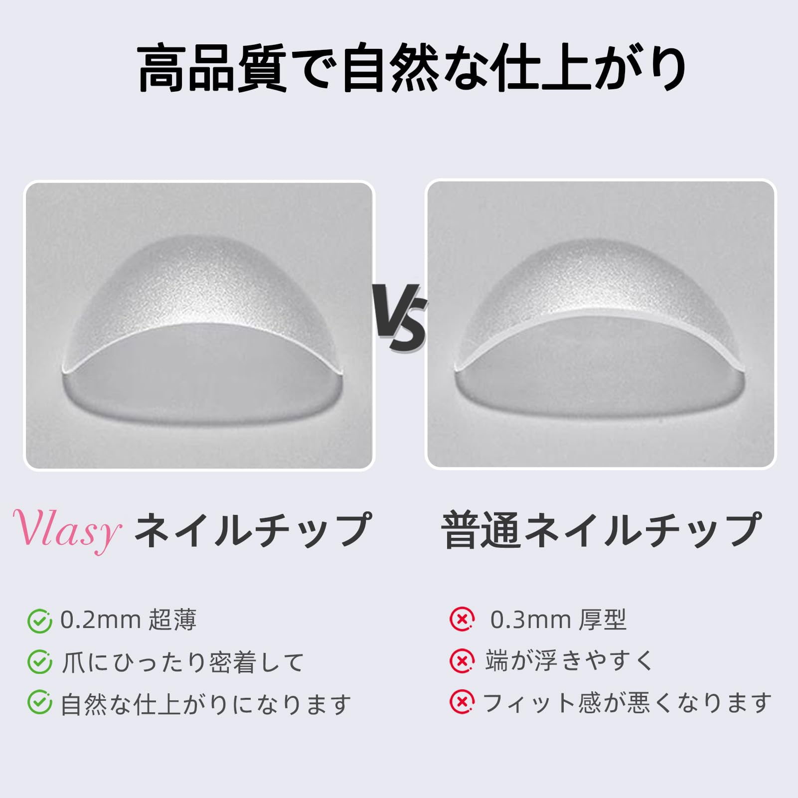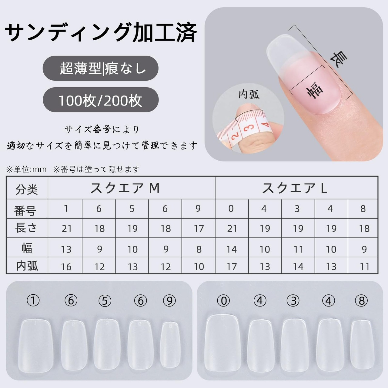 【特徴】R角インサートデザインと根元の極薄設計により、ネイルチップの弧を自然にし、自分の爪にぴったりフィットさせ、接着剤のこぼれを防ぐことができます。サンディング加工済み、面倒な下処理不要になります。