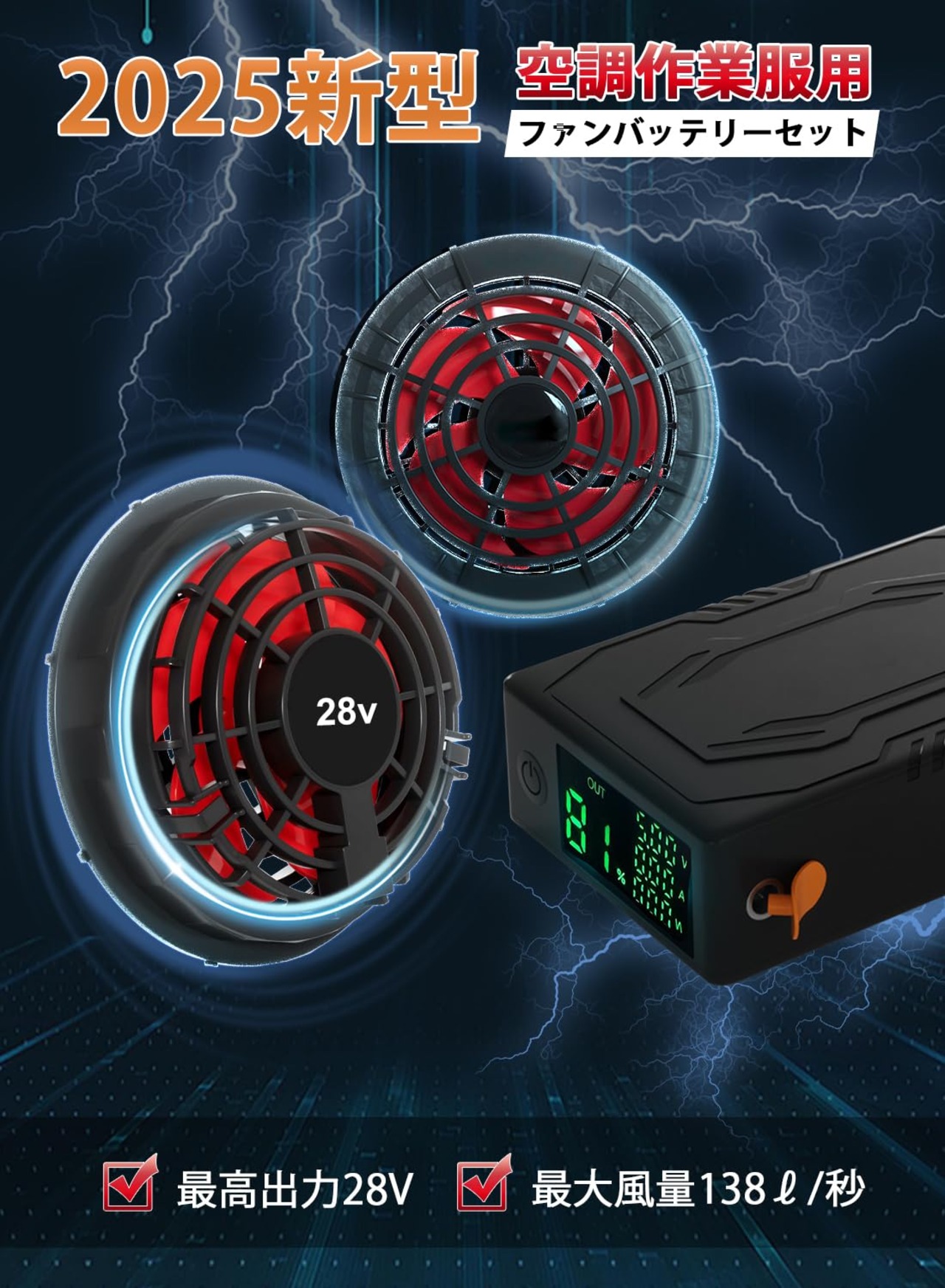 空調作業服 ファンバッテリーセット【2025最新&40000mAh大容量&28V暴風】日本製ブラシレスモーター 4段階風力調節 ファ ン付きベスト用 バッテリーセット LCD表示 超長時間稼働 PSE認証済み 空調ファン 熱中症対策 急速充電器付き 屋外作業 穴直径9cmのあらゆる作業着対応 暑さ対策グッズ