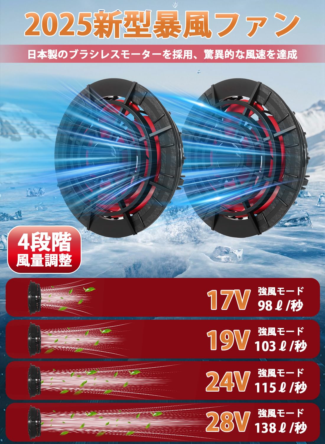 【28V爆風ファン&ブラシレスモーター搭載&瞬間冷却を実現】28V超強力ファン搭載、低騒音しながら、トップの大風量を達成しました。高密度ABS素材と高性能ブラシレスモーターを採用し、驚異的な省エネ性能・耐衝撃性・耐高温性を実現。約30,000時間の超長寿命に加え、安定した気流と静粛運転で騒音ストレスゼロ。空調ウェアーに取り付けて、一回電源ボタンを押して電池残量確認でき、再度電源ボタンを長押ししてファン起動、再度短く押すと4段階を調節してから、驚きの超強風量を体験でき、汗がすぐに蒸発するので、暖かく湿った空気を排出、爽快感を生み出し、圧倒的な涼しさを実現し、汗による皮膚病になりにくくなります。猛暑の夏に、工場や屋外作業などエアコンの使用できない環境で作業する人たちへの暑さ対策グッズです。