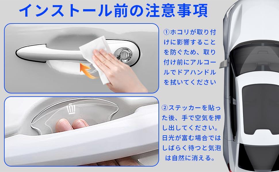 【防汚防傷】表面には最新のテクスチャー加工技術を使て、保護性はより強く、耐摩耗性、耐用性、耐熱性も素敵.ドアを開閉する時にドアハンドルを傷けることを防ぎ、ご愛車の塗装を守ります.滑らかな表面加工が傷を防ぎ、水が表面に止まれませんから、雨の日でも問題なし、365日までご愛車を保護します.高品質ゴム材質のため、静電気防止ができ、冬の時にドアを開閉しても心配不要です.