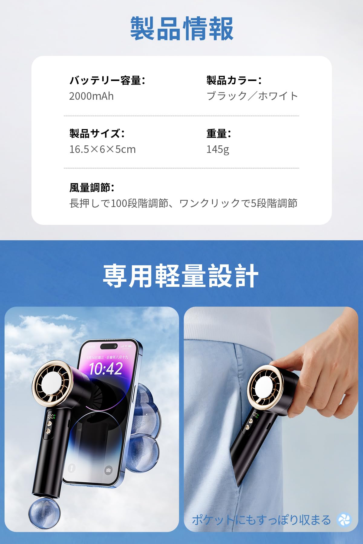 ハンディファン ハンディ扇風機 100段階超高速・強風量 冷却機能付き 長時間稼働・省エネのハンディファ USB急速充電 超軽量 熱中症対策 暑さ対策 手持ち扇風機 ブラック