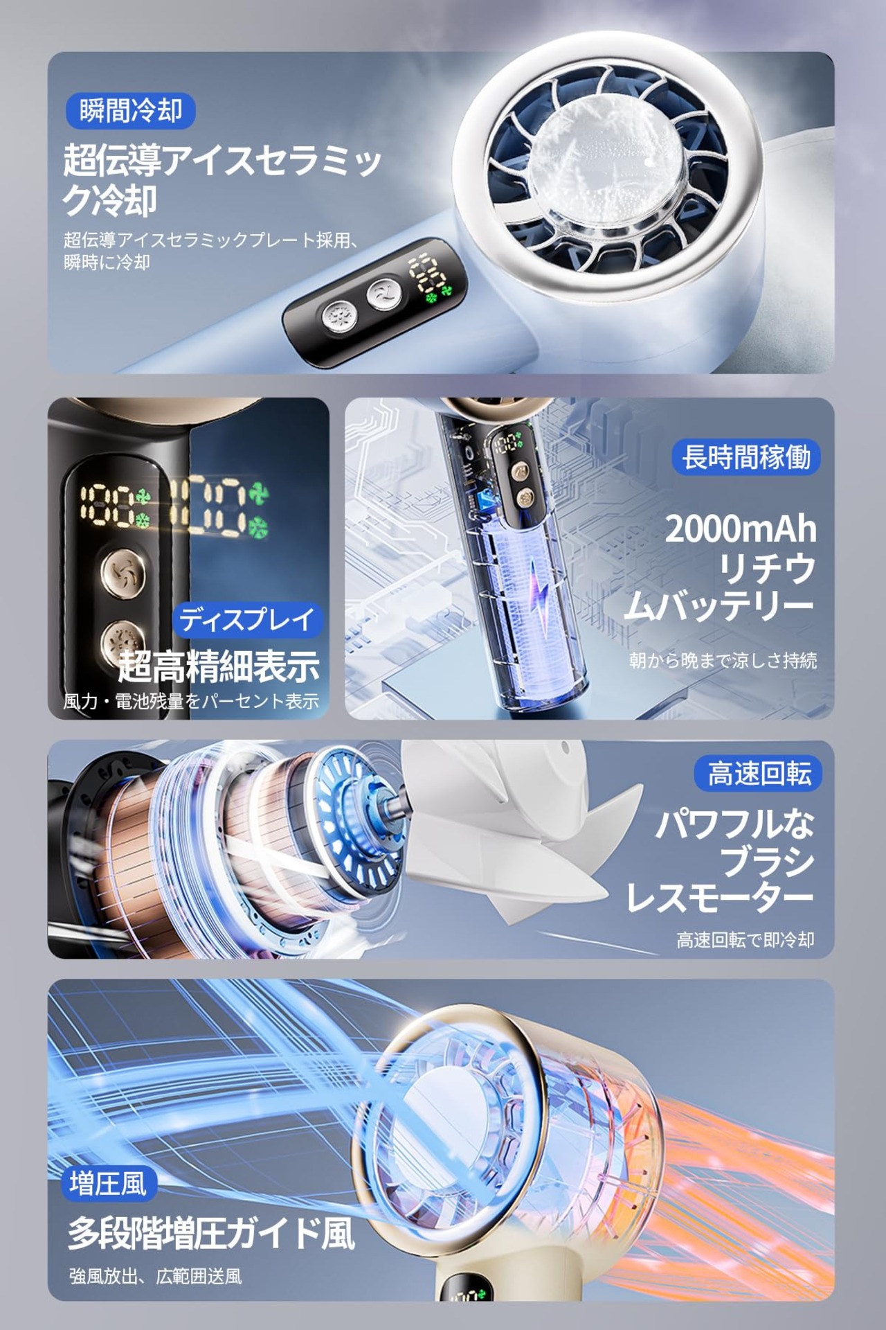 【冷却機能付きのひんやりハンディファン】このハンディファンには、超伝導アイスセラミック冷却プレートが搭載されており、肌に直接触れることで体感温度を瞬時に下げることができます。ハンディファンの送風中に冷却ボタンを押すと、プレートが急速に冷え、頬・おでこ・手首・首元などに当てると、ひんやりとした冷感が得られます。炎天下でも氷のような冷たさを感じることができ、熱を帯びた肌をやさしく冷やしてくれる、真夏に最適なハンディファンです。