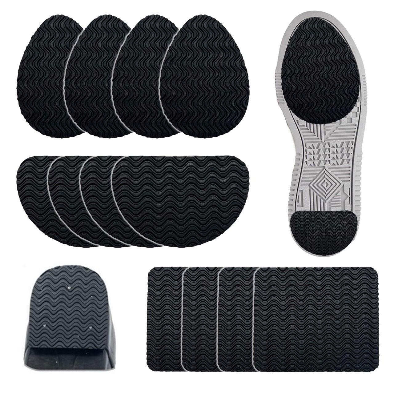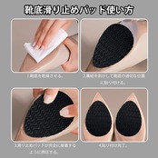 【商品仕様】靴底滑り止めパッド6ペア12枚セット。素材:ゴム。色:ブラック。つま先+かかと各4枚、スクエアインソール4枚、靴底の形状に合わせて自由にカットすることができます。