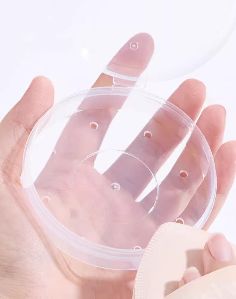 【通気性あり】底部に設けられた8つの通気孔が、内部の湿気を逃がしつつ、化粧パフを衛生的で乾燥した状態に保ちます。