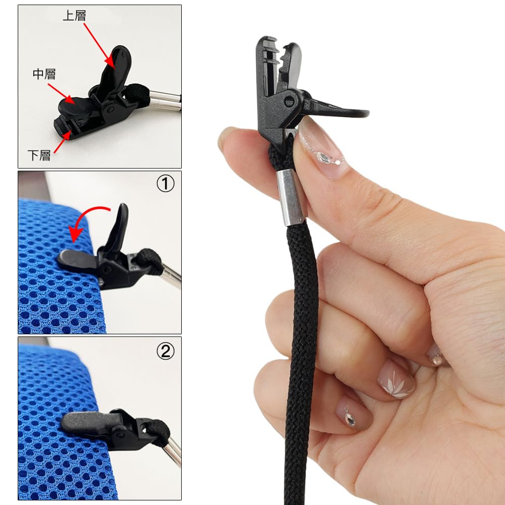 ??両端はワニ口のグリップ、固定すると帽子をしっかり挟むことができます。