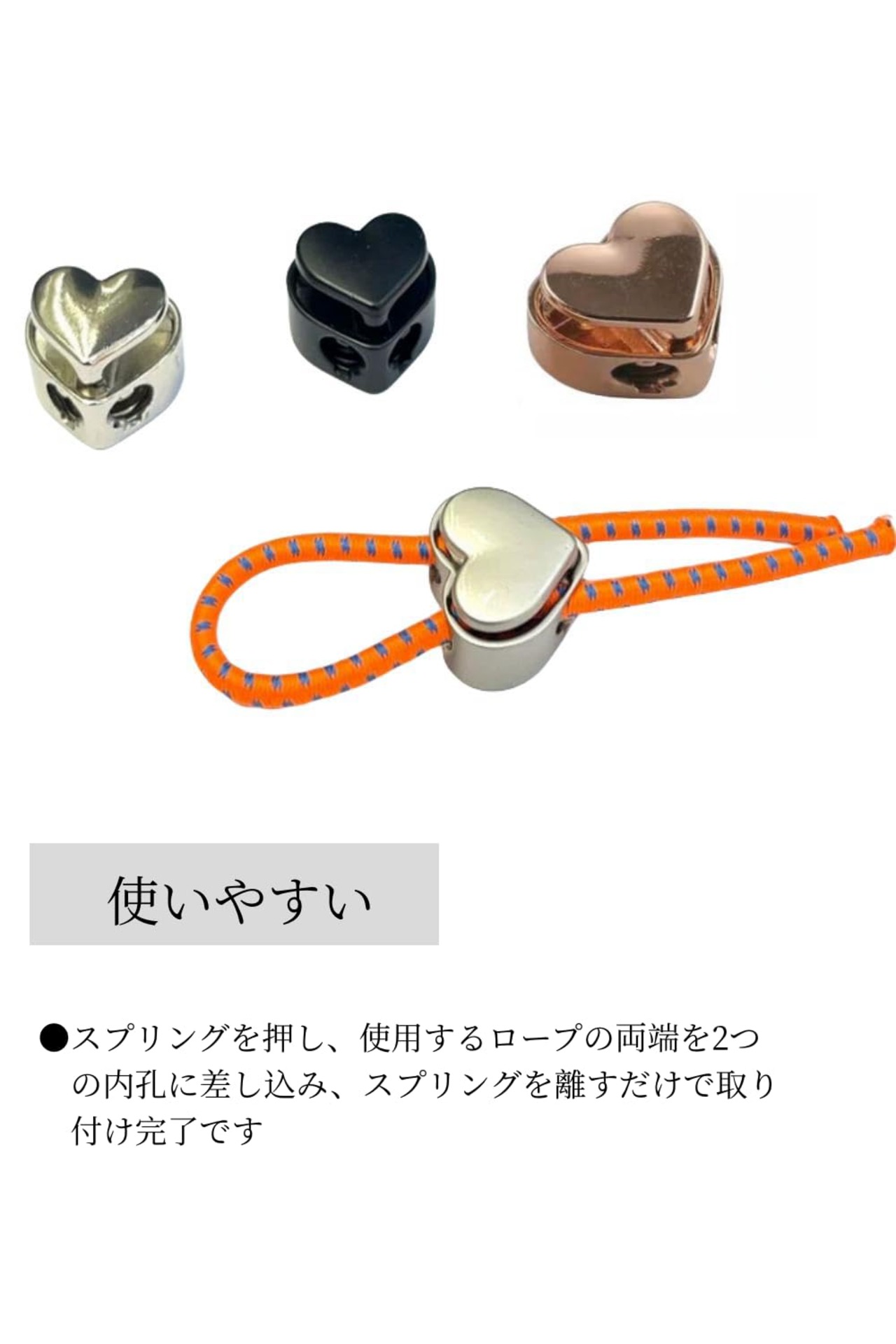 【使いやすい】スプリングを押し、使用するロープの両端を2つの内孔に差し込み、スプリングを離すだけで取り付け完了です。