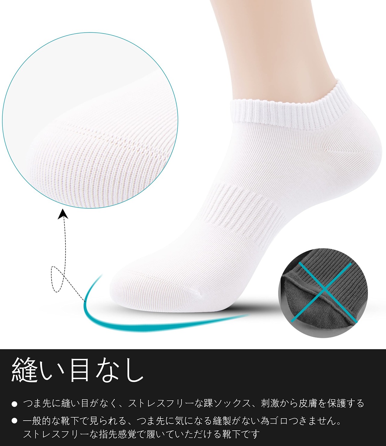 縫い目なし: つま先に縫い目がなく、ストレスフリーな踝ソックス、刺激から皮膚を保護する。遊離ホルムアルデヒド試験に合格した肌に優しい靴下(厚生省令第34号、JIS L 1041)。3D縫い目なし編織技術、一體成形、履いている時も快適です