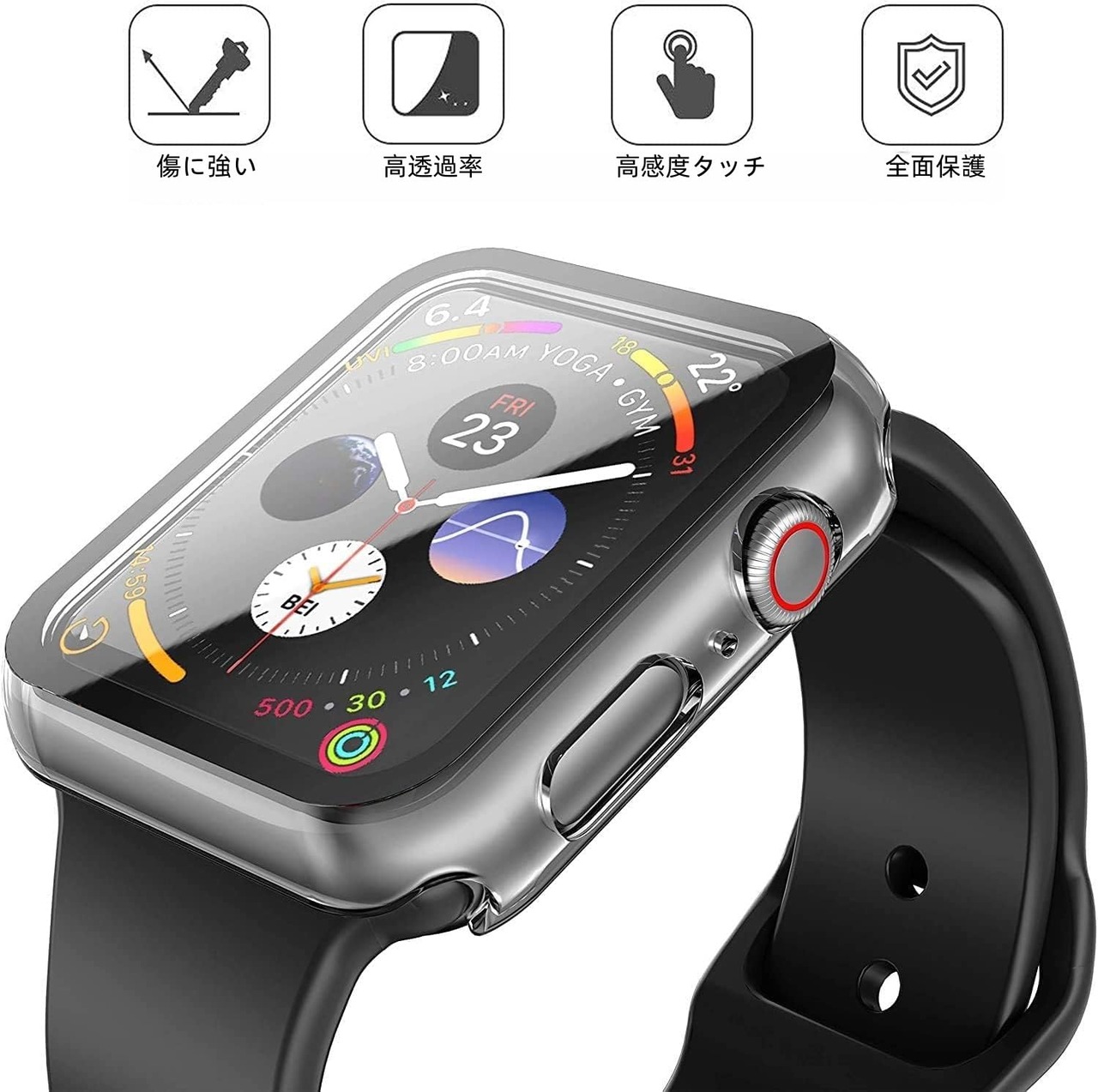 ご注意:運動時に、ケースとスクリーンの隙間に水や汗が入り込むことがあり,タッチ感度に影響しますので、シャワーや運動の前にケースをお取り外しようにしてください。※手洗いする際に、接着面の隙間からお水が入ってしまう事はございますので、水に濡れないようにご注意ください。パッケージ内容:1 x ウェットクロス +ドライクロス、1 x Apple Watch Series 6 / SE / Series 5 / Series 4 40mm 用 ケース (クリア)