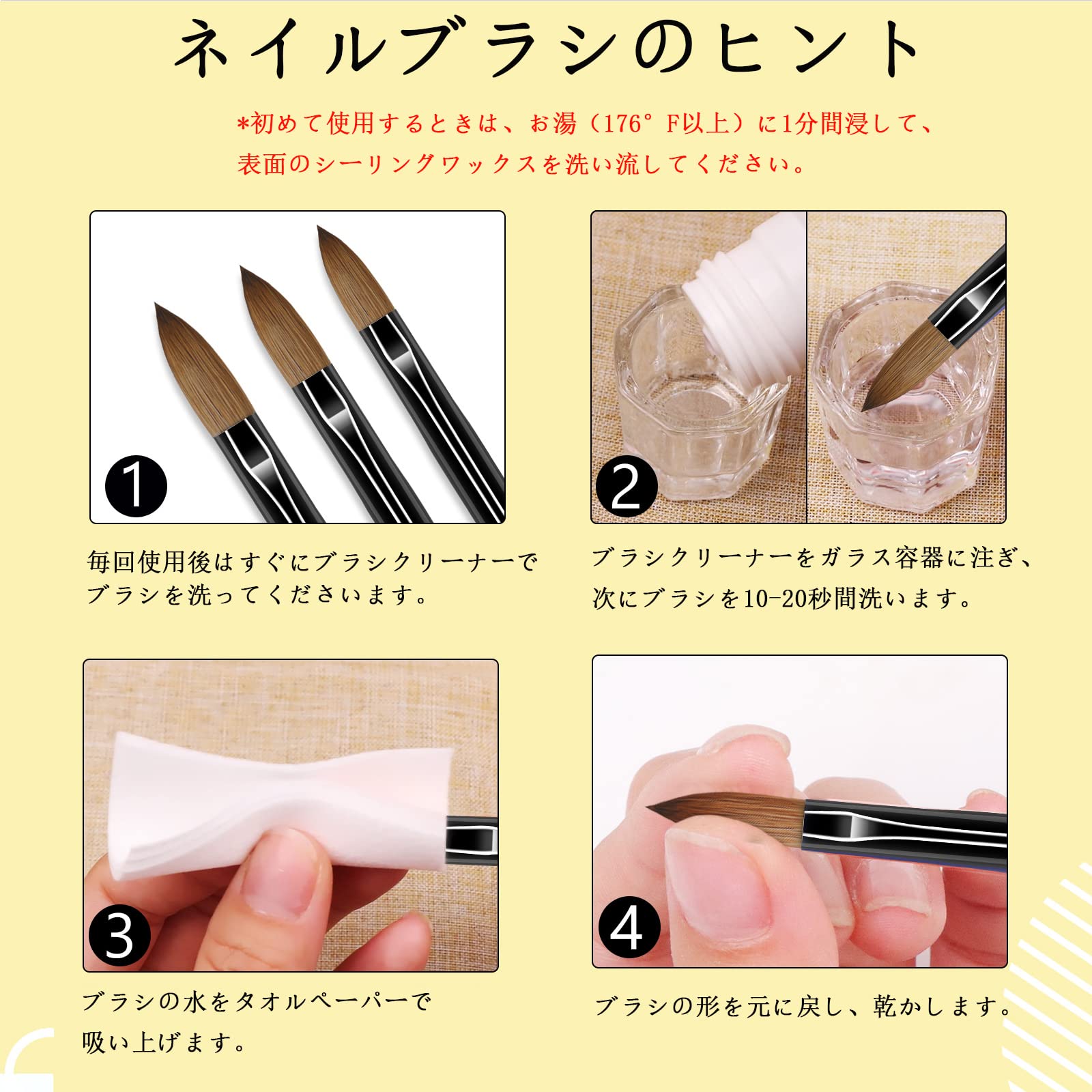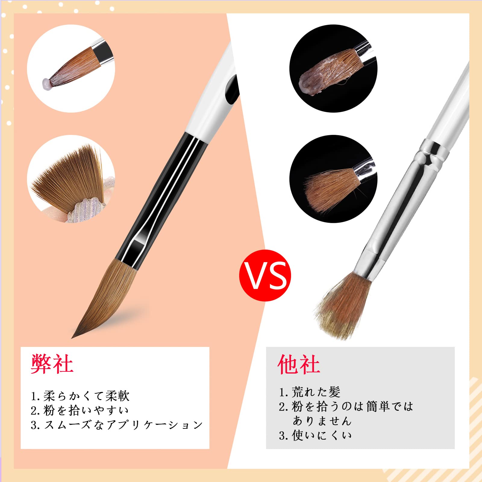 [ 暖かいヒント ] アクリルネイルブラシはアクリルアプリケーションシステムにのみ使用できます。ブラシの毛が硬化して寿命が短くなるのを防ぐため、使用後はすぐにブラシセーバーまたはアクリルリキッドでブラシの毛を掃除してください。当社のプロ用アクリルブラシセットに何か問題がございましたら、お気軽にお問い合わせください。いつでもお手伝いいたします。