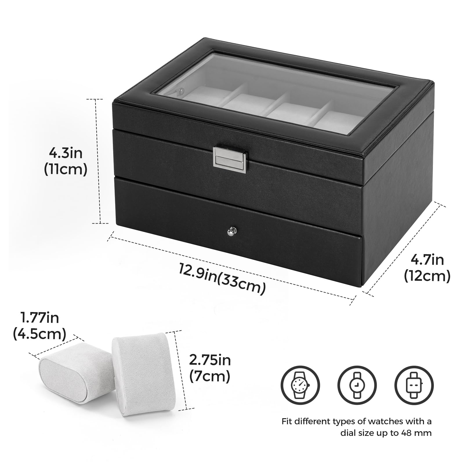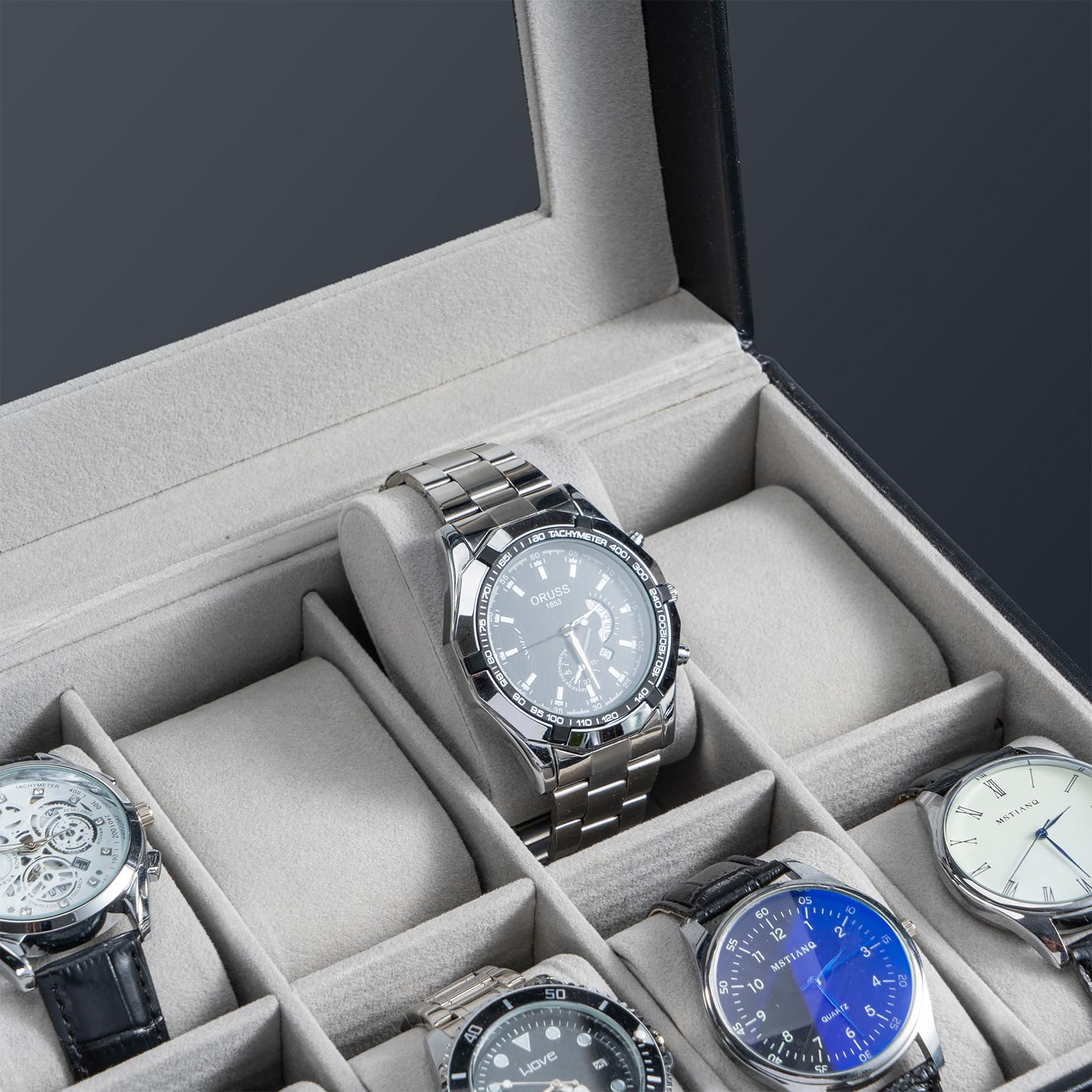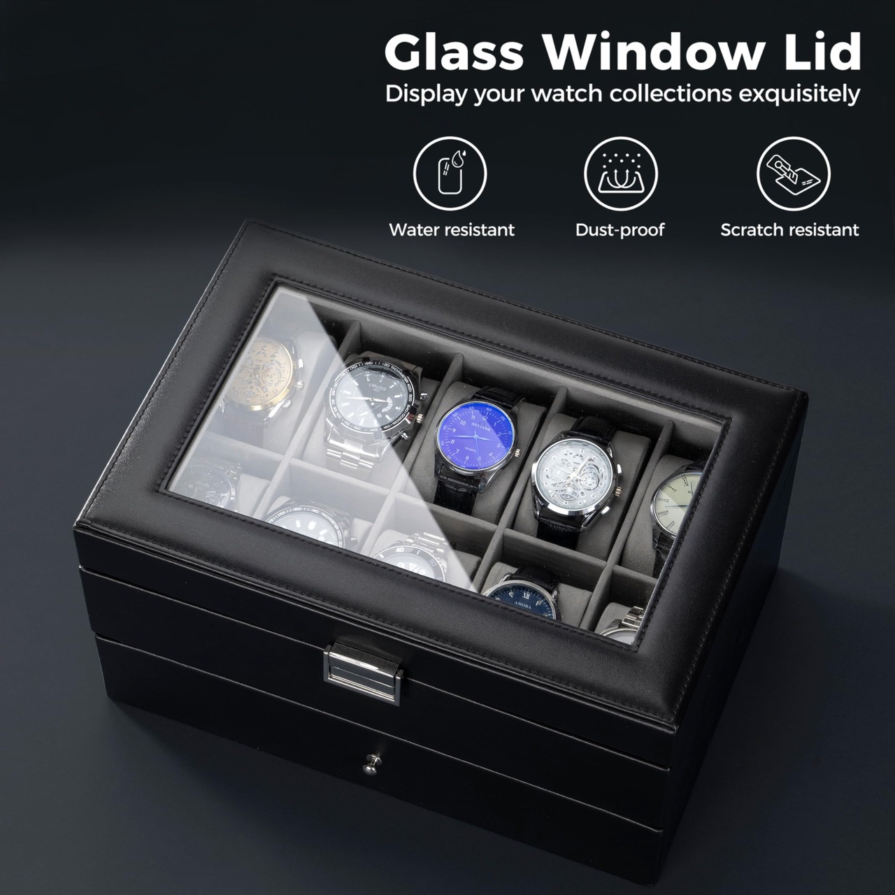 ?【サイズ】幅×奥行×高さ:約33×12×11cm;腕時計を10本まとめて収納できる高級感あふれる蓋つきケース。※すべての時計に対応してはいませんので、発注前、必ずサイズをご確認いただきます。