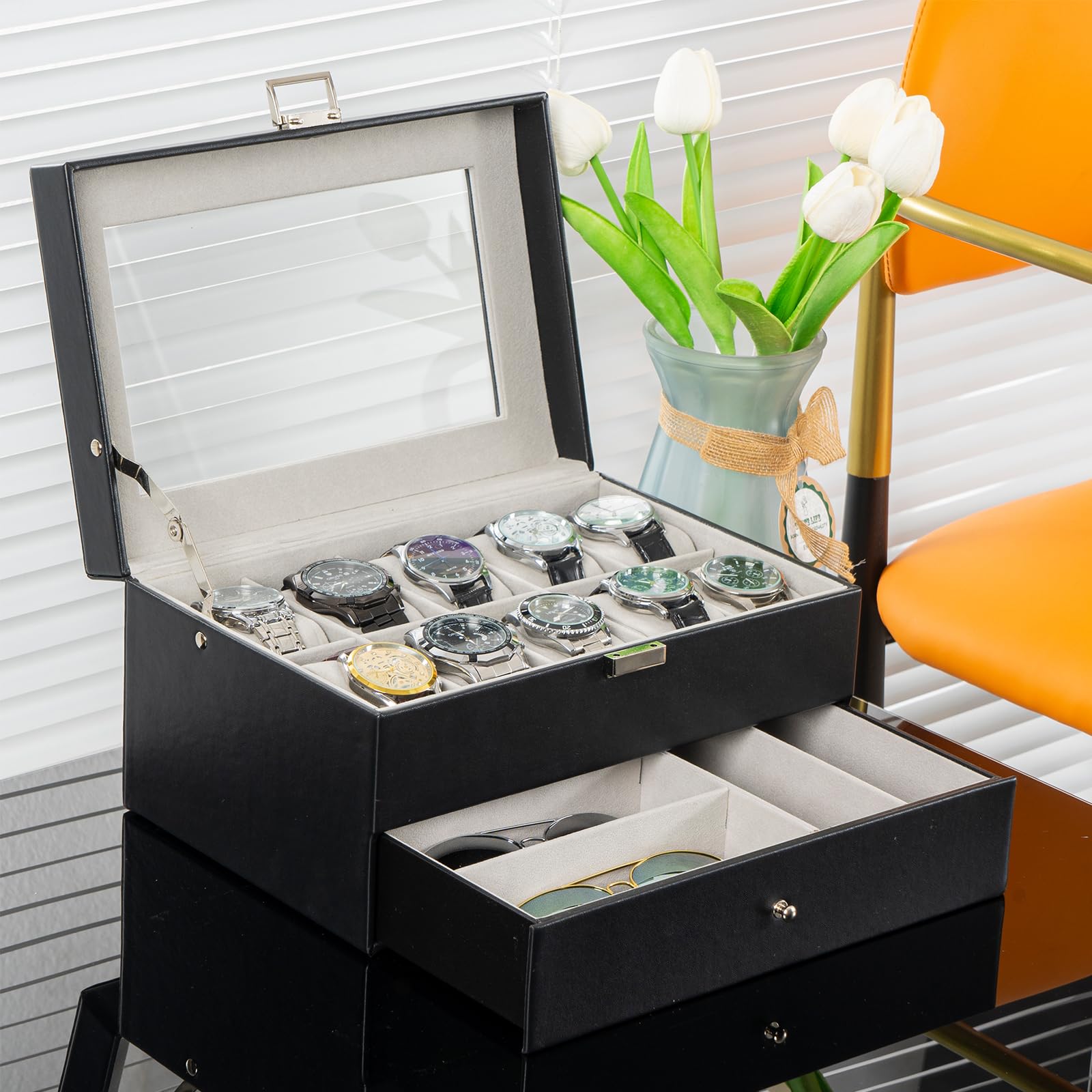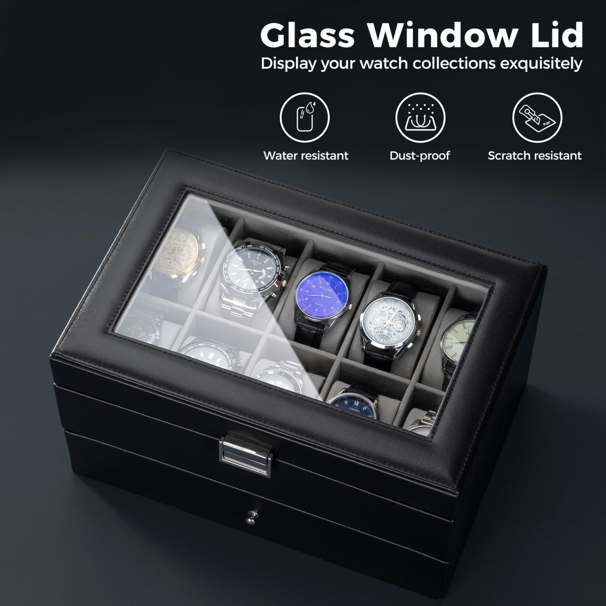 ProCase 腕時計ケース [10本用]、腕時計&ジュエリー 収納ボックス、ディスプレイケース 小物整理 取外し可能な土台 贈り物- ブラック