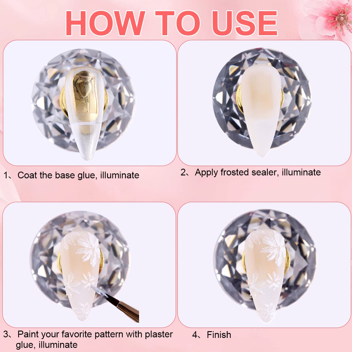 【使用方法】1.まず甲片にプライマーを塗ります。LEDライトを照射して凝固させ、2.研磨シールを塗り、LEDライトを照射して凝固させ、3.石膏ゲルで好みの色を描き、LEDライトを凝固させると、自分のネイルデザインが完成する。