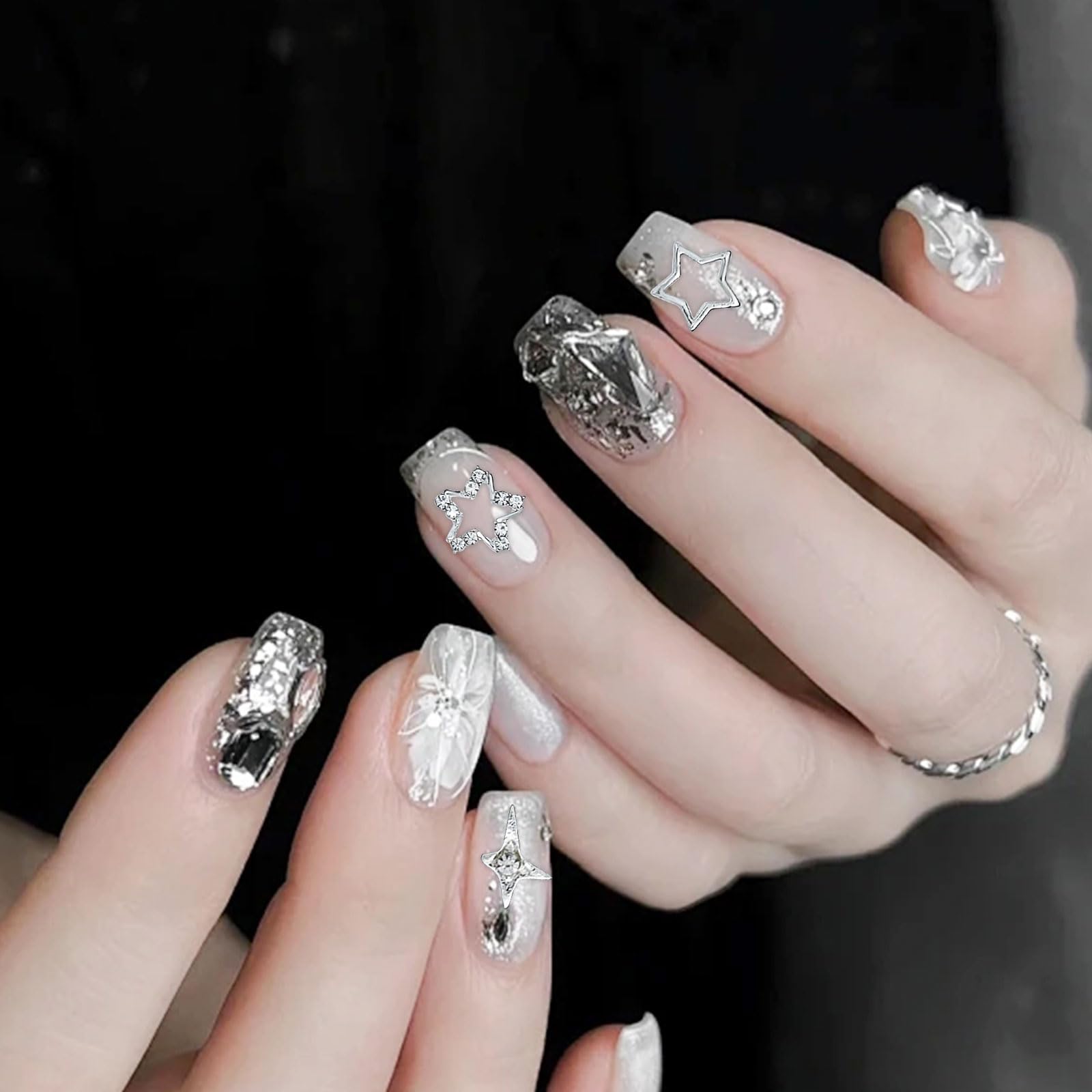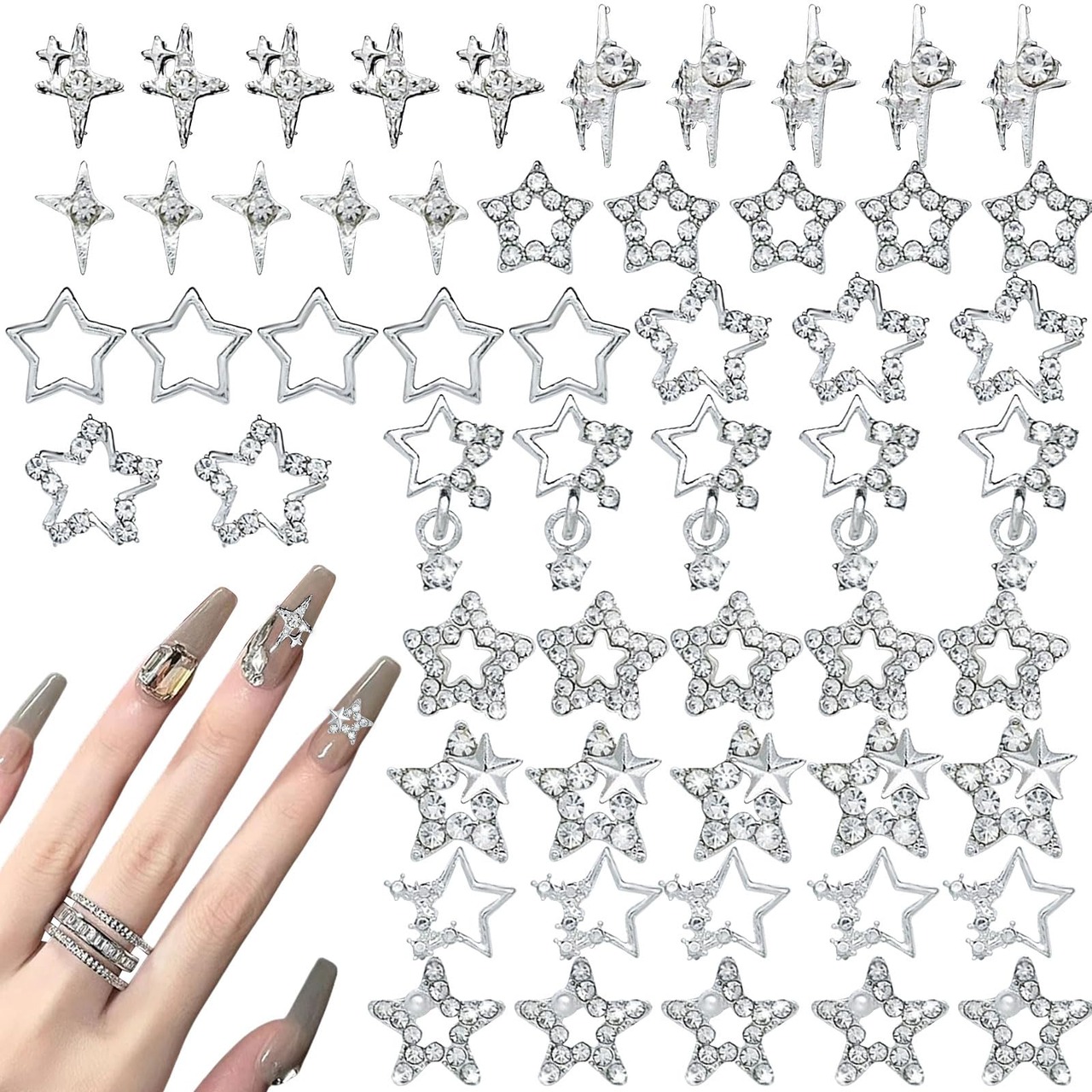 ネイルパーツ 星 55個セット 3D 立体 星 ネイルパーツ ストーン キラキラ 大きめ Y2K 五芒星 ネイルアート デコパーツ シルバー メタルパーツ ジュエリーパーツ 手芸 ハンドメイド (シルバー)