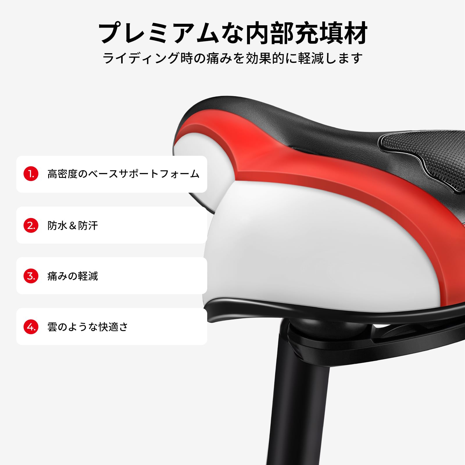 ★【高いクッション性】 クッション性に優れた低反発の衝撃吸収材を使用し快適な乗り心地をします。 また、ダブルスプリングゴムボールが付いておりサドル本体のクッション性に加えスプリングで路面の衝撃を吸収し柔らかい着座感で安定した走行を実現します。耐摩耗性の高い滑り止め防水PUを表面に採用し、内側を人工脂肪ゲル層で構成することで高い防水性と耐久性を同時に実現しています。