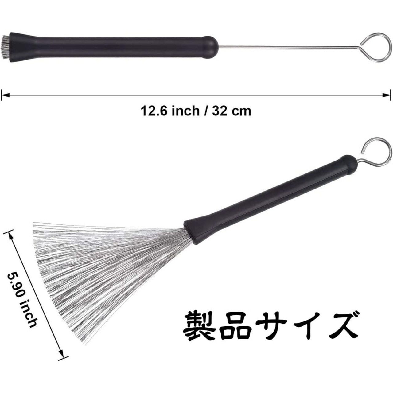 収納式デザイン:ドラム用ほうきは収納式デザインで、使用しないときはブラシの一端を収納して損傷を防ぎ、もう一端には吊り下げるためのループが付いているので、持ち運びや収納が簡単にできます。