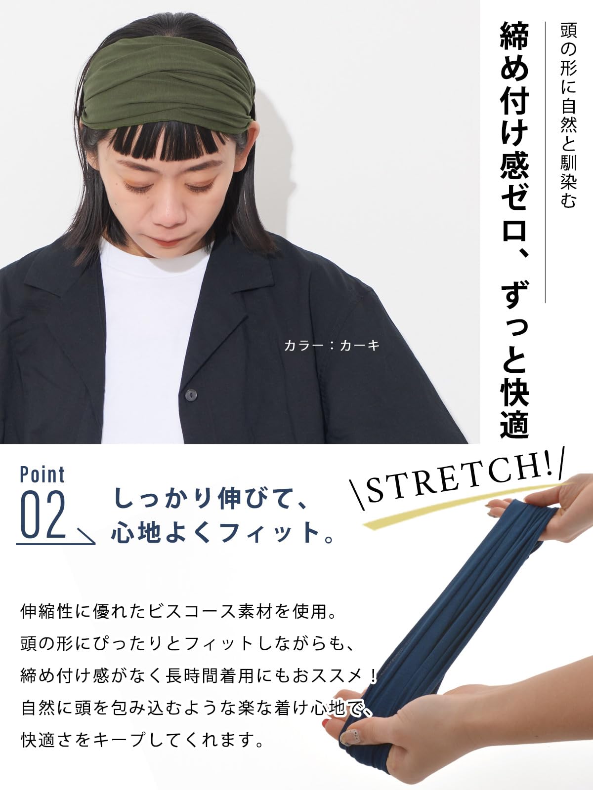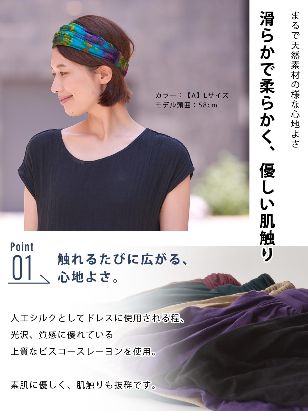【なめらかな肌触り】人工シルクとして、ドレスにも使用されていたほど、光沢や質感に優れているビスコースレーヨンを使用。繊維が細く長いので、なめらかでさらりとした肌触り。幅広で柔らかく、頭部へのフィット感抜群です。外出などの様々なシーンで活躍するヘアバンドです。