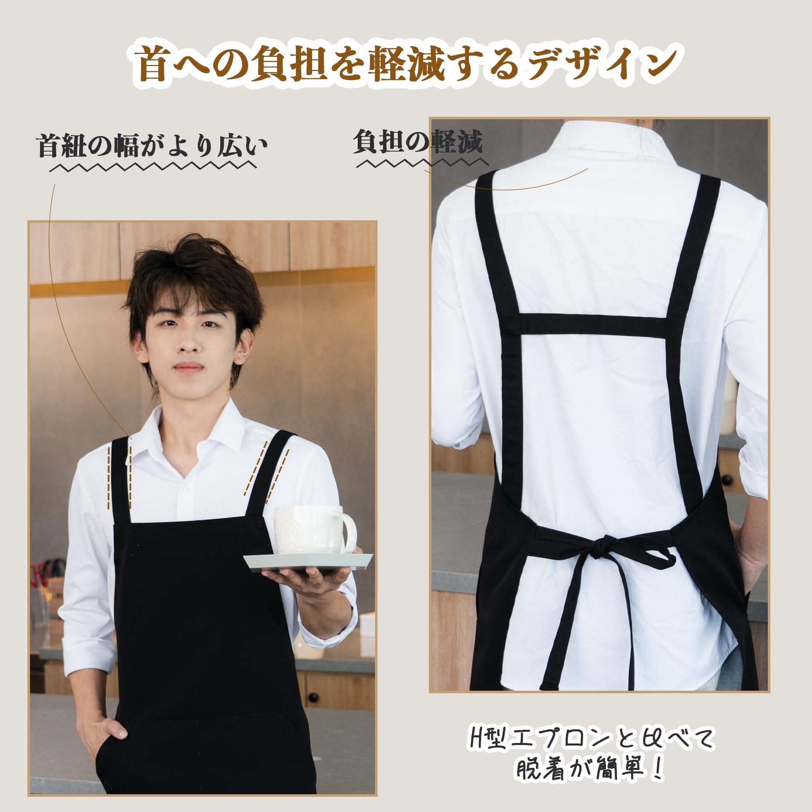 [Jocube] エプロン H型 首掛け シンプル 男性用 メンズ カフェエプロン 無地 おしゃれ 大容量ポケット 汚れにくい シワになりにくい 男女兼用 ノーアイロン 透けない ポケット付き 料理教室用