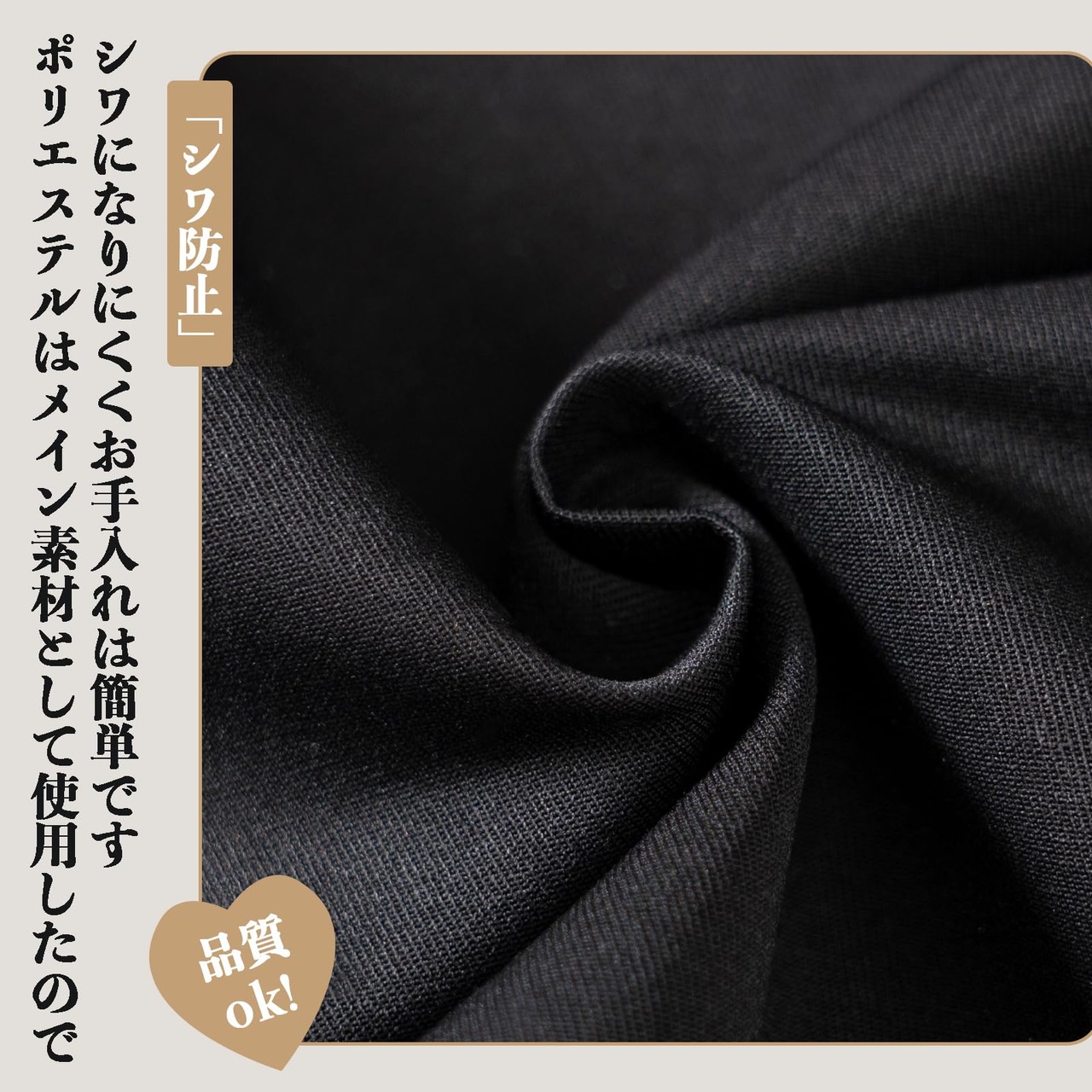 【手入れが簡単】高級感のある厚手の生地を使用し、エプロンの理想的な生地配合である綿35%、ポリエステル65%を採用しています。丈夫でシワがつきにくく、速乾性があり、縮まず、色落ちしにくいと高評価を得ている人気商品です。また、生地は透けないため、しっかりとした耐久性を持ち、長くご愛用いただけます。