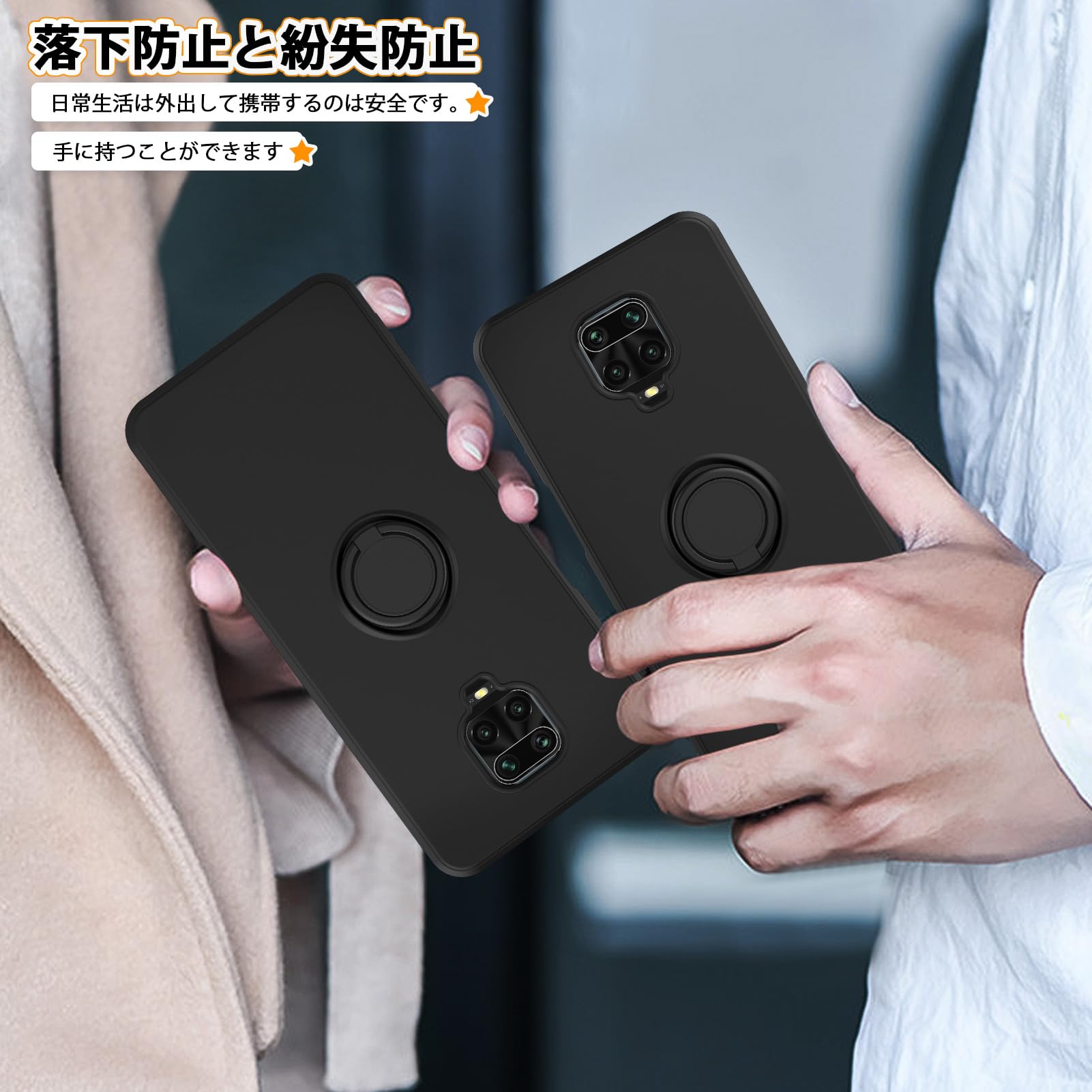【スタンド機能】:ケースを横置きにするとスタンド機能になり、持たず動画鑑賞などを楽しむことができます。一指着る式で、指がリングに通り抜け、片手で携帯を操作でき、落下防止します。