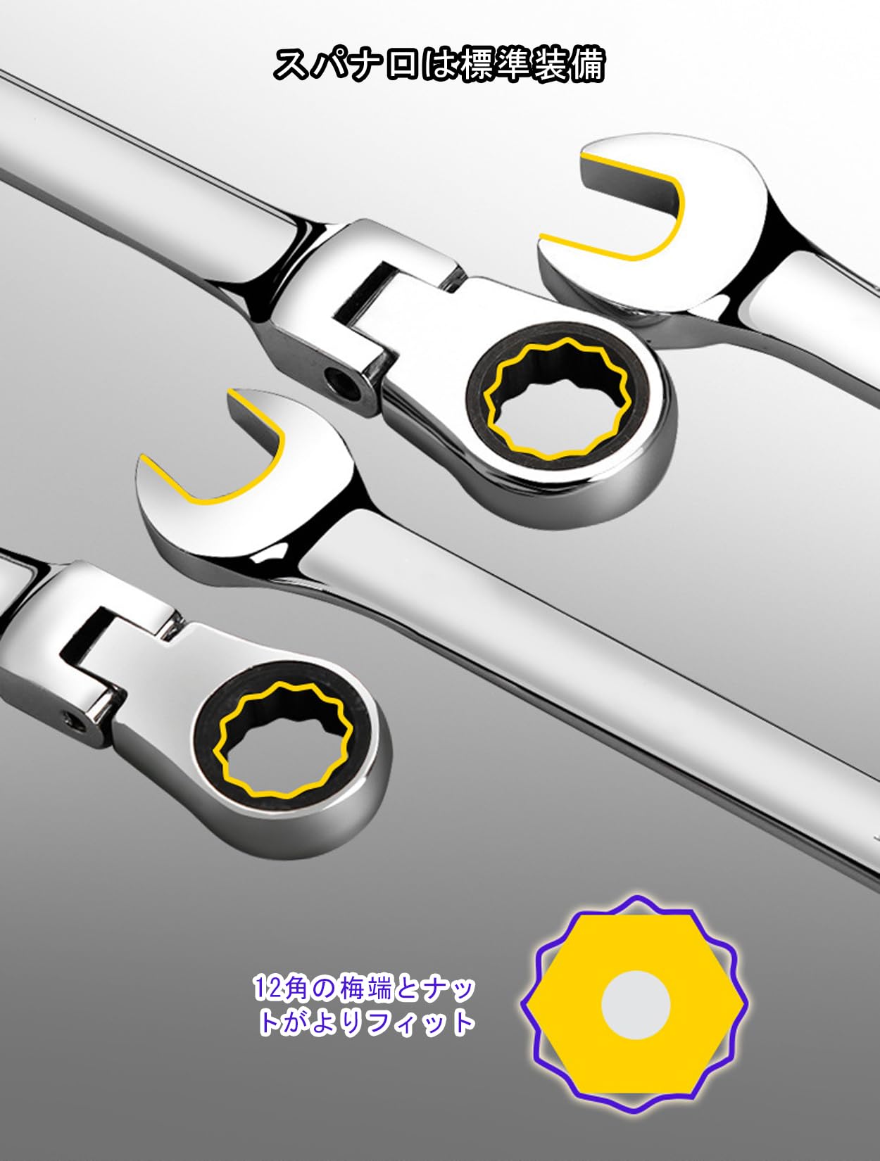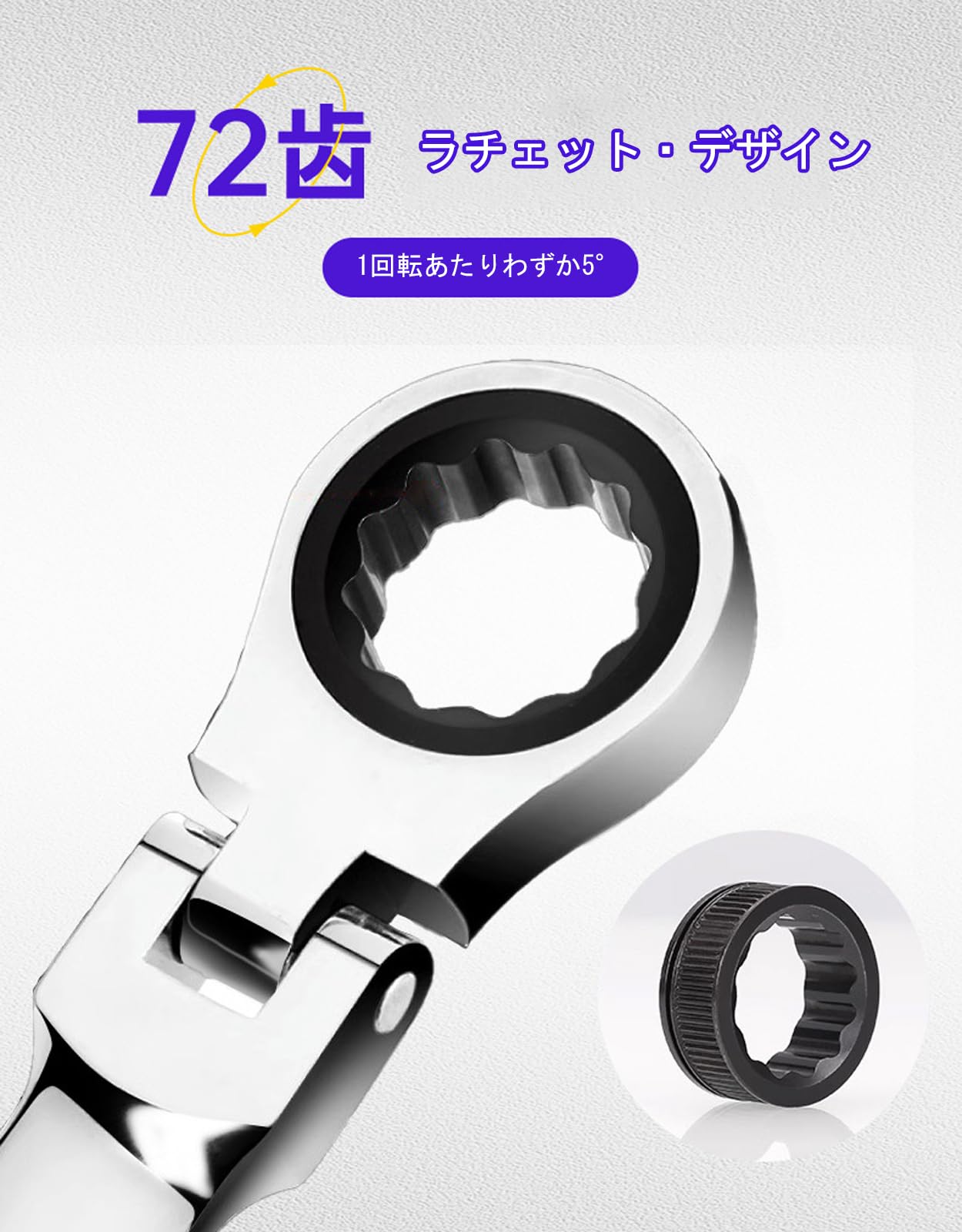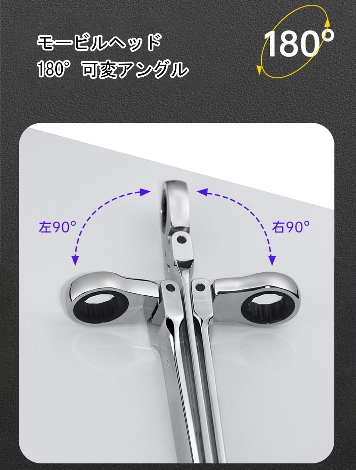 【自由な角度調整】独特の首振りデザインにより、レンチのヘッドは0〜180°の範囲で柔軟に調整できます。これにより狭いスペースの障害物を回避し、十分な握りスペースを確保できます。72歯のデザインと組み合わせることで、ナットをしっかりと掴むことができ、またレンチのヘッドには回転方向を示す矢印があり、使い勝手が向上します。