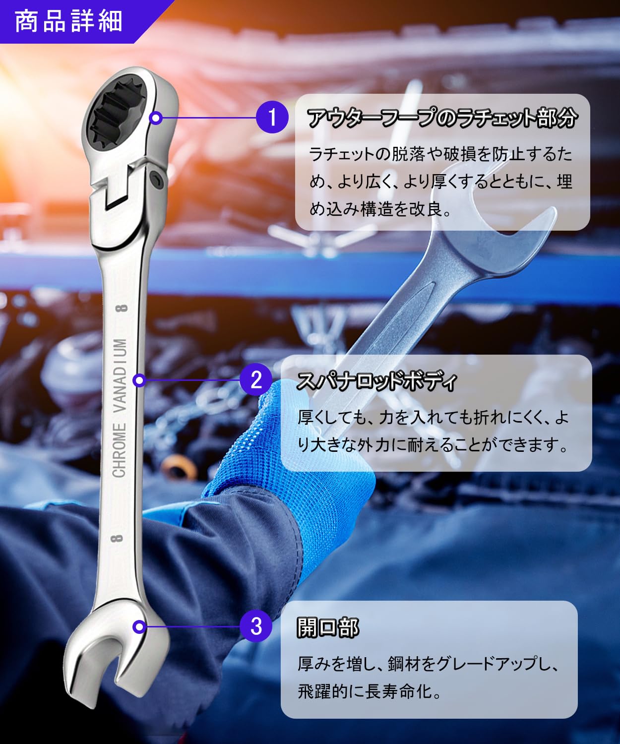 【多様なシーンで活躍】この棘??手セットは螺栓やナットの締め緩めだけでなく、機械の組み立て、設備保守、パイプ作業、自転車や車両のメンテナンスなど、さまざまなシーンに対応しています。72歯の設計により、狭いエンジンルームなどの制約のある空間でも簡単にアクセスでき、5°の送り角により細かな作業が可能で効率が向上します。