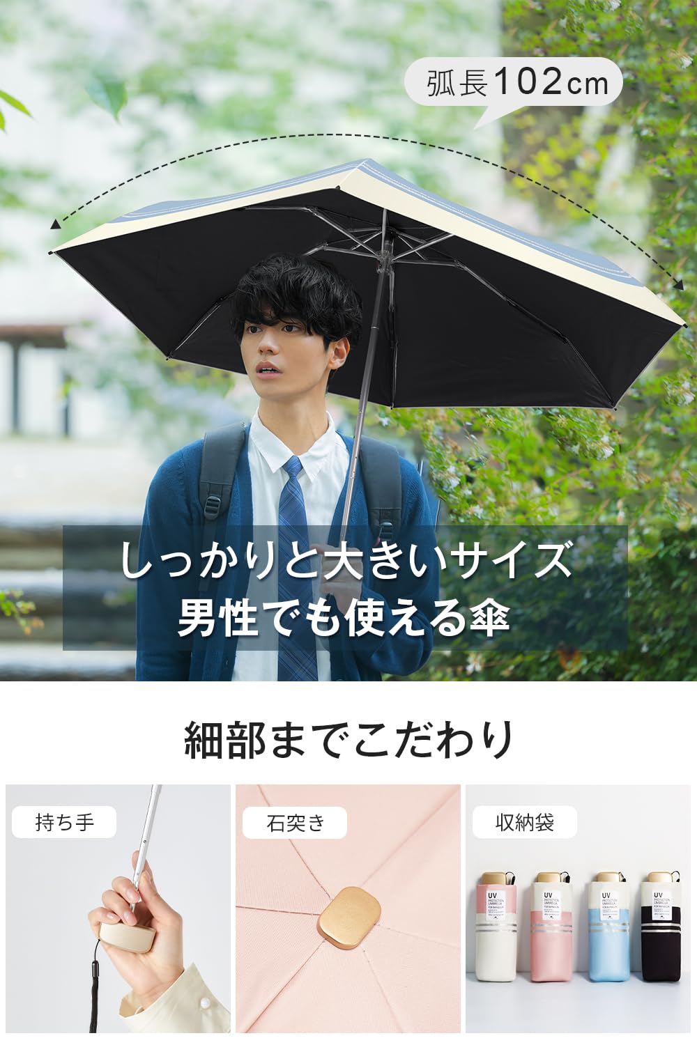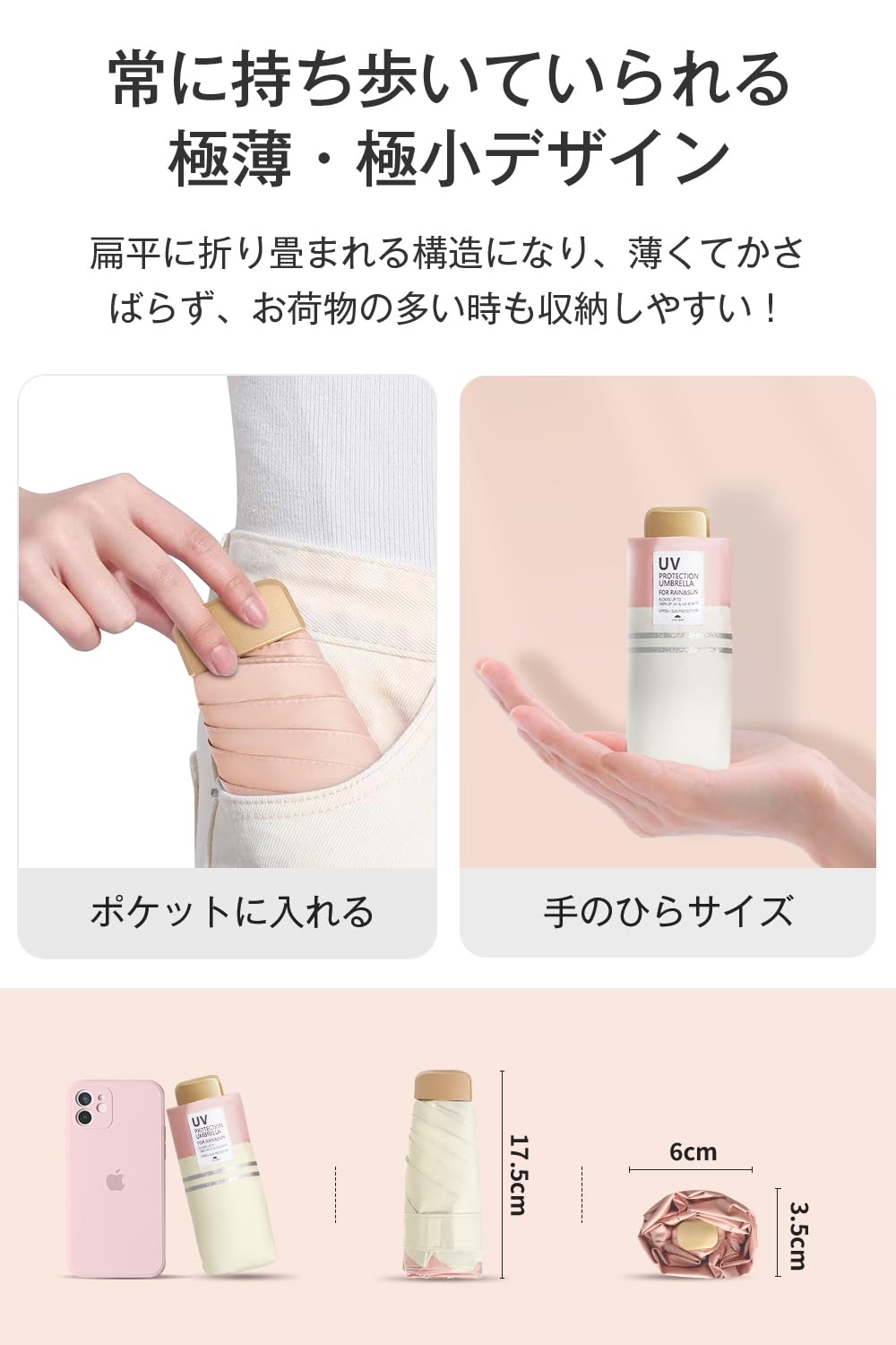 【極薄・極コンパクト・極軽!日傘を常備するのが楽になる】 扁平に折り畳まれる構造を採用、収納時は17.5x6x3.5cmの極小・極薄?になり、ポケットにも入れるサイズ感です。さらに、約198gの?極軽デザインで、 折りたたみ日傘をカバンに入れっぱなしにしても負担になりません?また、デザインも重視のおしゃれ日傘はメンズもレディースも使いやすい!通勤、通学、旅行、出張などビジネスシーンでもプライベートでもシーンを問わず様々なシーンで大活躍!