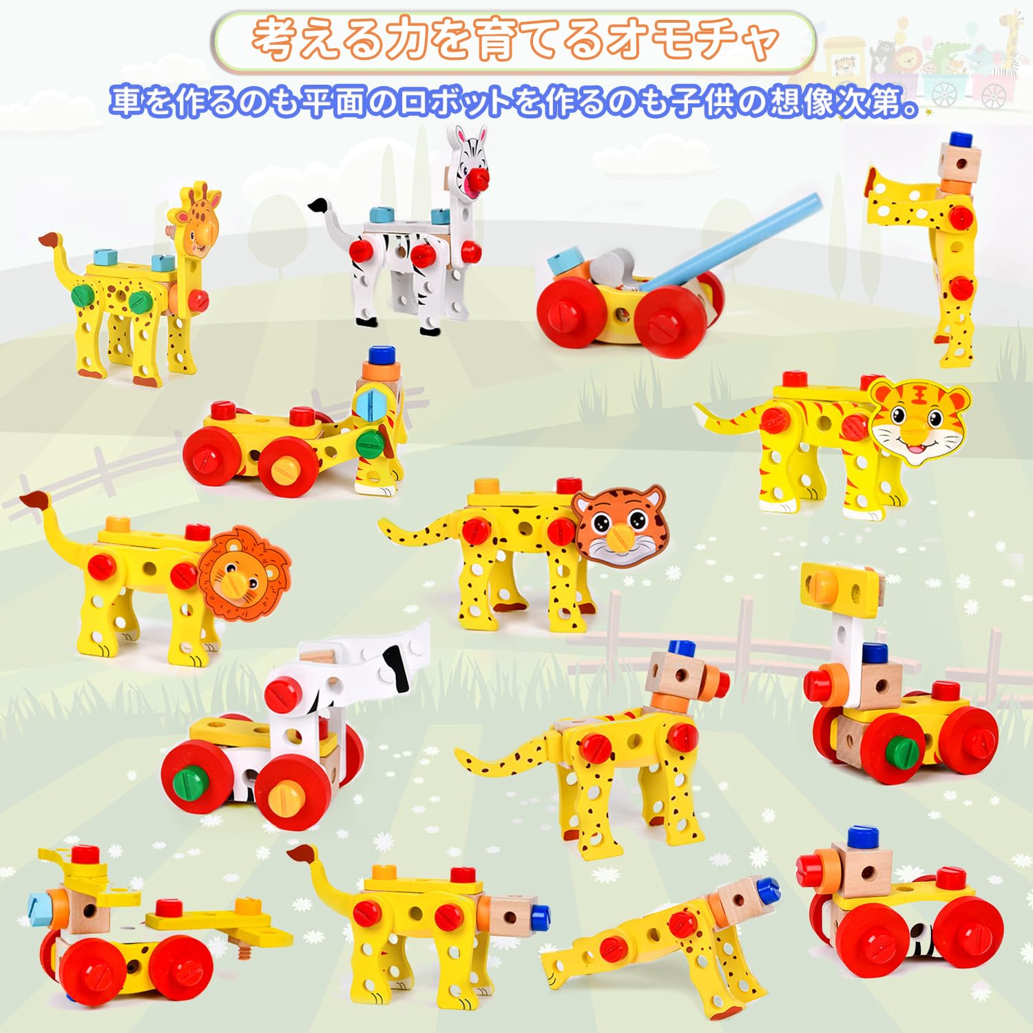 【超豪華、大量セット】2 in1 計112パーツ( 乗り物51パーツ+ 動物61パーツ):パーツ同士を組み合わせて乗り物や動物のようなものを作れますが。大工さんごっこが楽しめるおもちゃ。