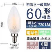 【電球の商品情報】 ? ?E12口金(12mm) ?明るさ:720lm ?定格消費電力:6W(60W形相当)?色温度:2700K電球色 ?サイズ:直径35㎜*高さ98㎜ ?Ra?80 ?調光対応不可 ?定格??:100V 50 / 60Hz ?材質:磨りガラスの材質 ?光束角:360°広配光型