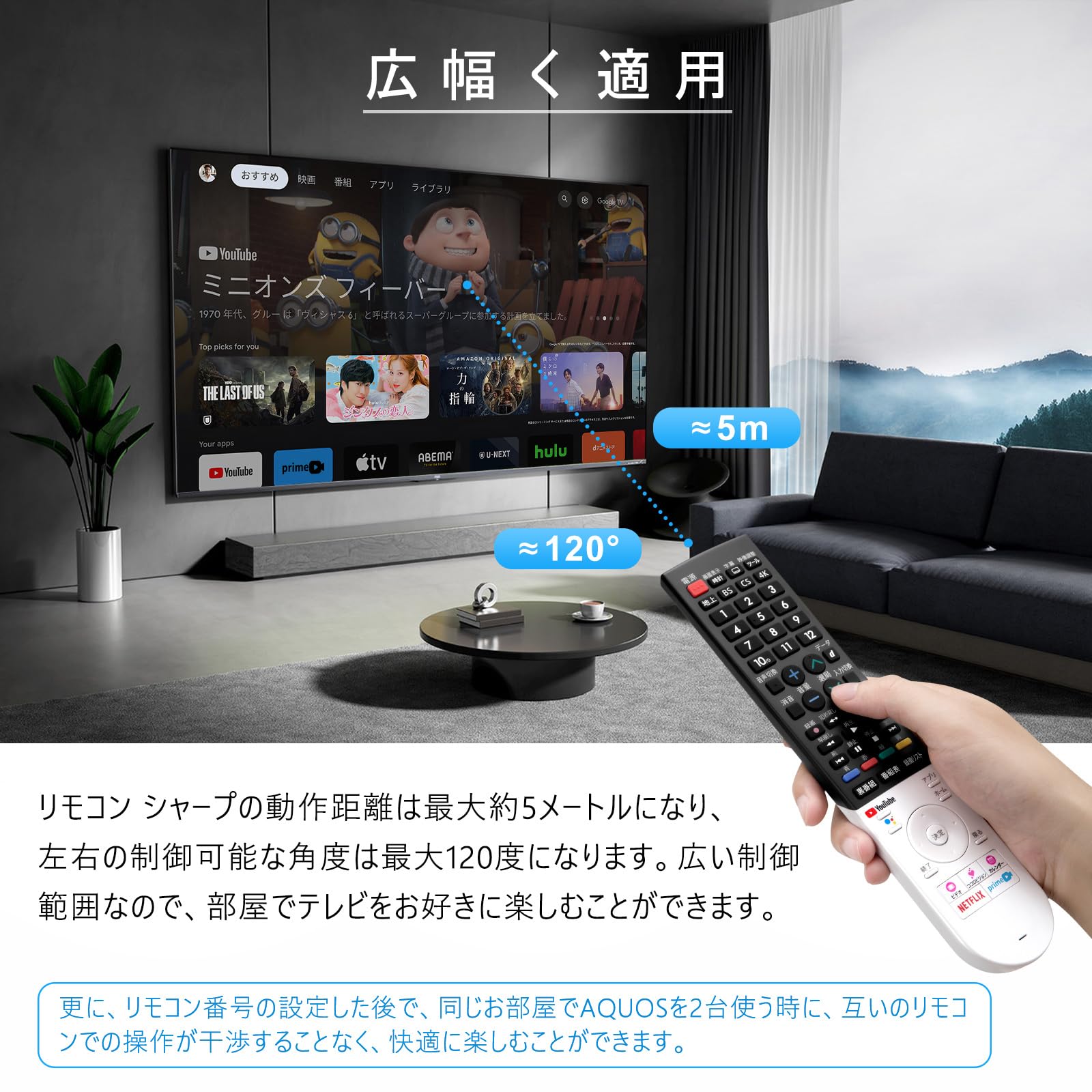 【広幅く適用】テレビリモコン シャープの動作距離は最大約5メートルになり、左右の制御可能な角度は最大120度になります。広い制御範囲なので、部屋でテレビをお好きに楽しむことができます。更に、アクオス リモコン番号の設定した後で、同じお部屋でAQUOSを2台使う時に、互いのリモコンでの操作が干渉することなく、快適に楽しむことができます。