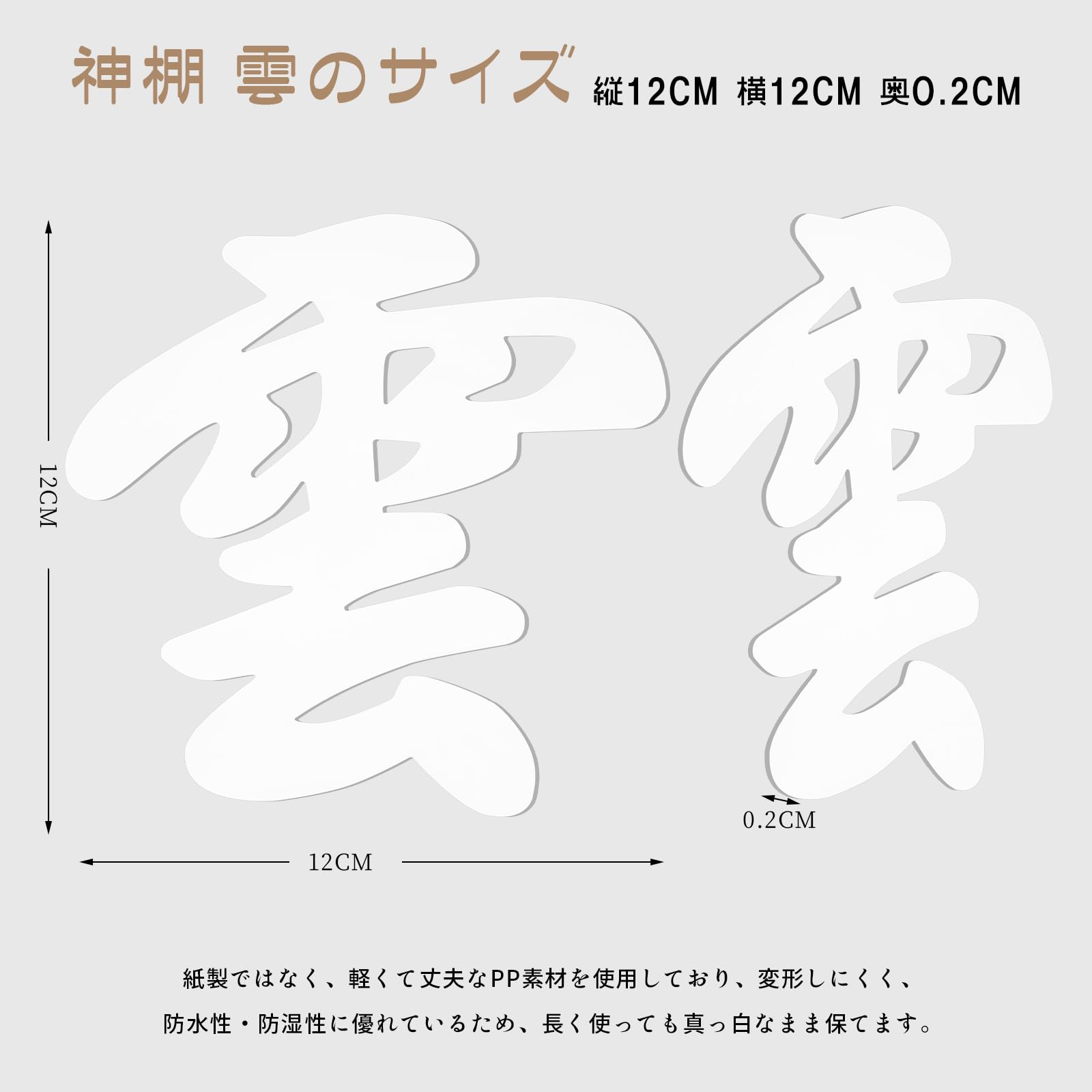 「神棚 雲の仕様・サイズ」サイズ:縦12cm × 横12cm × 厚さ0.2cm 素材:環境にやさしい発泡PP素材。
